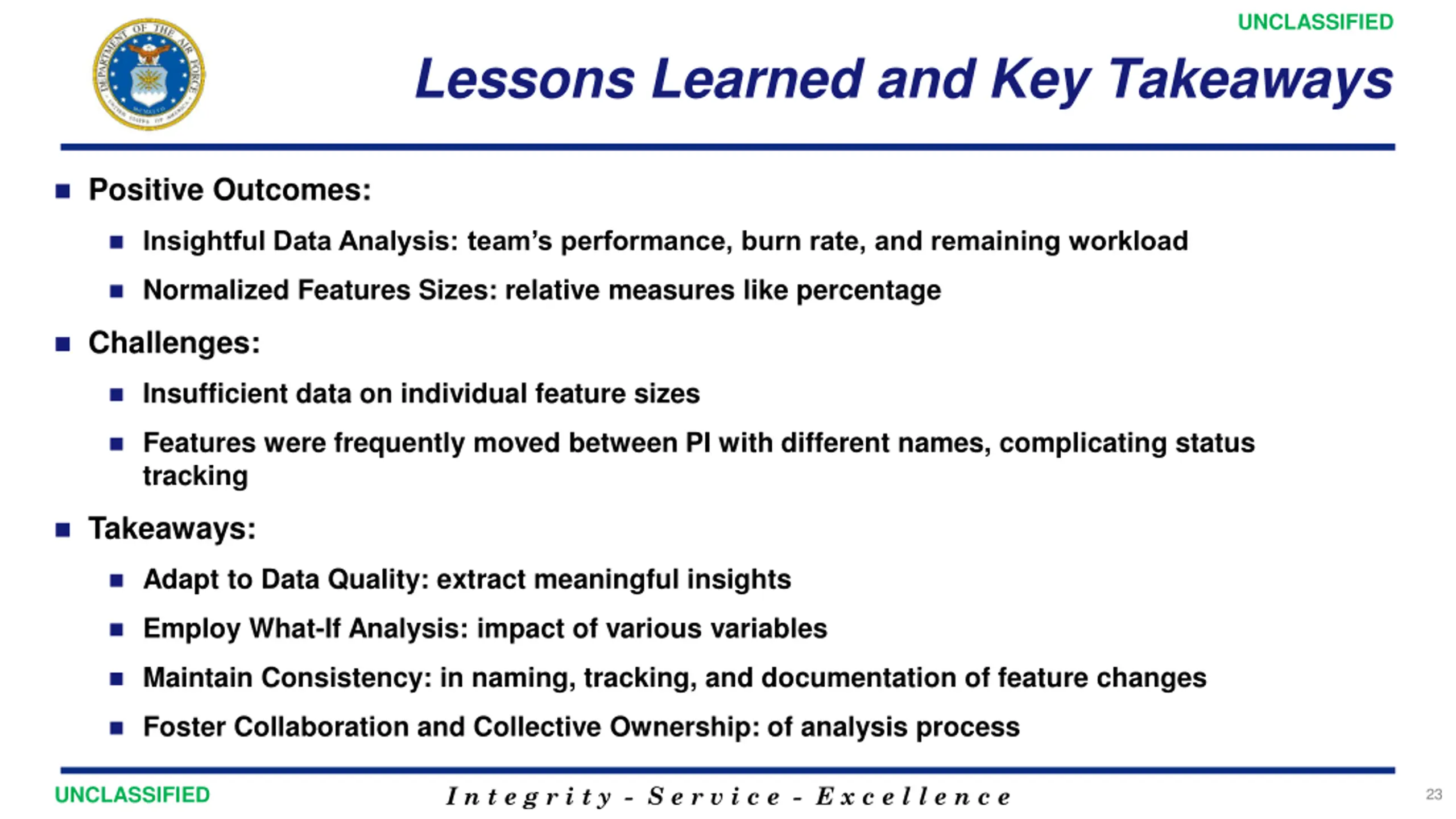 UNCLASSIFIED Lessons Learned and Key Takeaways Positive Outcomes: Insightful Data Analysis: team s performance, burn rate, and remaining workload Normalized Features Sizes: relative measures like percentage Challenges: Insufficient data on individual feature sizes Features were frequently moved between PI with different names, complicating status tracking Takeaways: Adapt to Data Quality: extract meaningful insights Employ What-If Analysis: impact of various variables Maintain Consistency: in naming, tracking, and documentation of feature changes Foster Collaboration and Collective Ownership: of analysis process I n t e g r i t y - S e r v i c e - E x c e l l e n c e UNCLASSIFIED 23