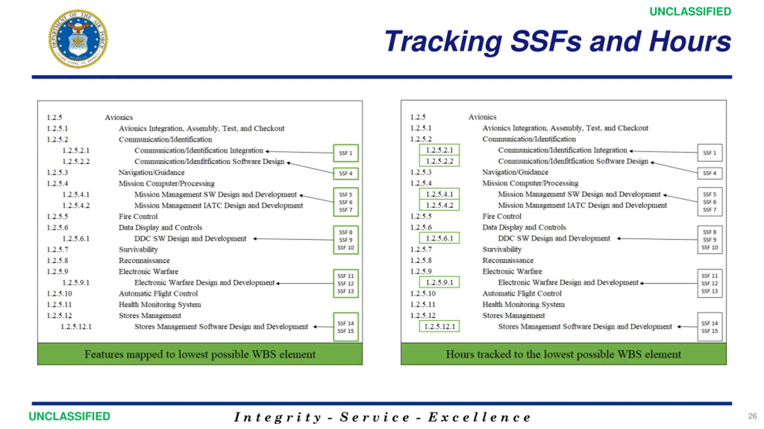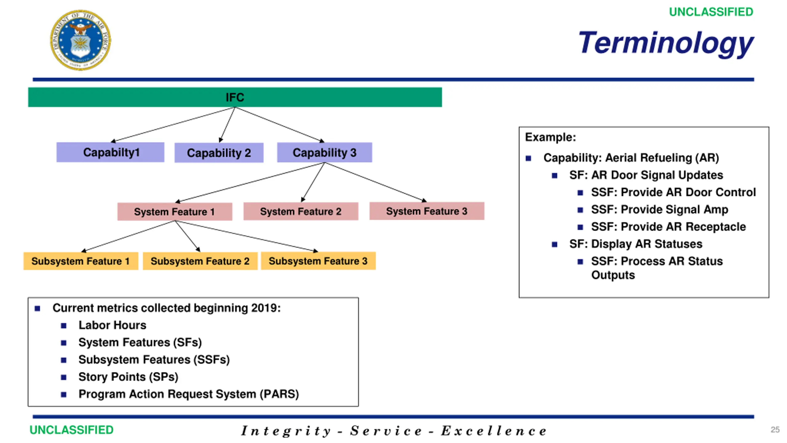 UNCLASSIFIED Terminology IFC Example: Capabilty1 Capability 3 Capability 2 Capability: Aerial Refueling (AR) SF: AR Door Signal Updates SSF: Provide AR Door Control SSF: Provide Signal Amp SSF: Provide AR Receptacle SF: Display AR Statuses SSF: Process AR Status Outputs System Feature 3 System Feature 2 System Feature 1 Subsystem Feature 3 Subsystem Feature 1 Subsystem Feature 2 Current metrics collected beginning 2019: Labor Hours System Features (SFs) Subsystem Features (SSFs) Story Points (SPs) Program Action Request System (PARS) I n t e g r i t y - S e r v i c e - E x c e l l e n c e UNCLASSIFIED 25