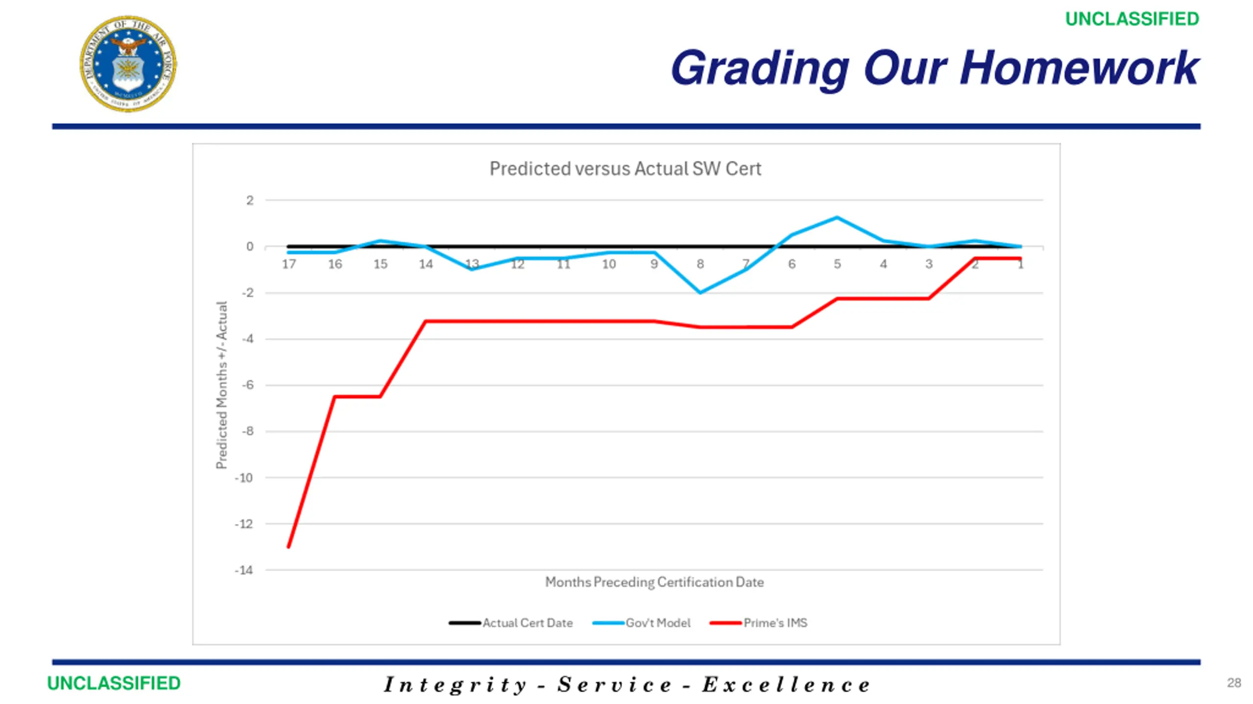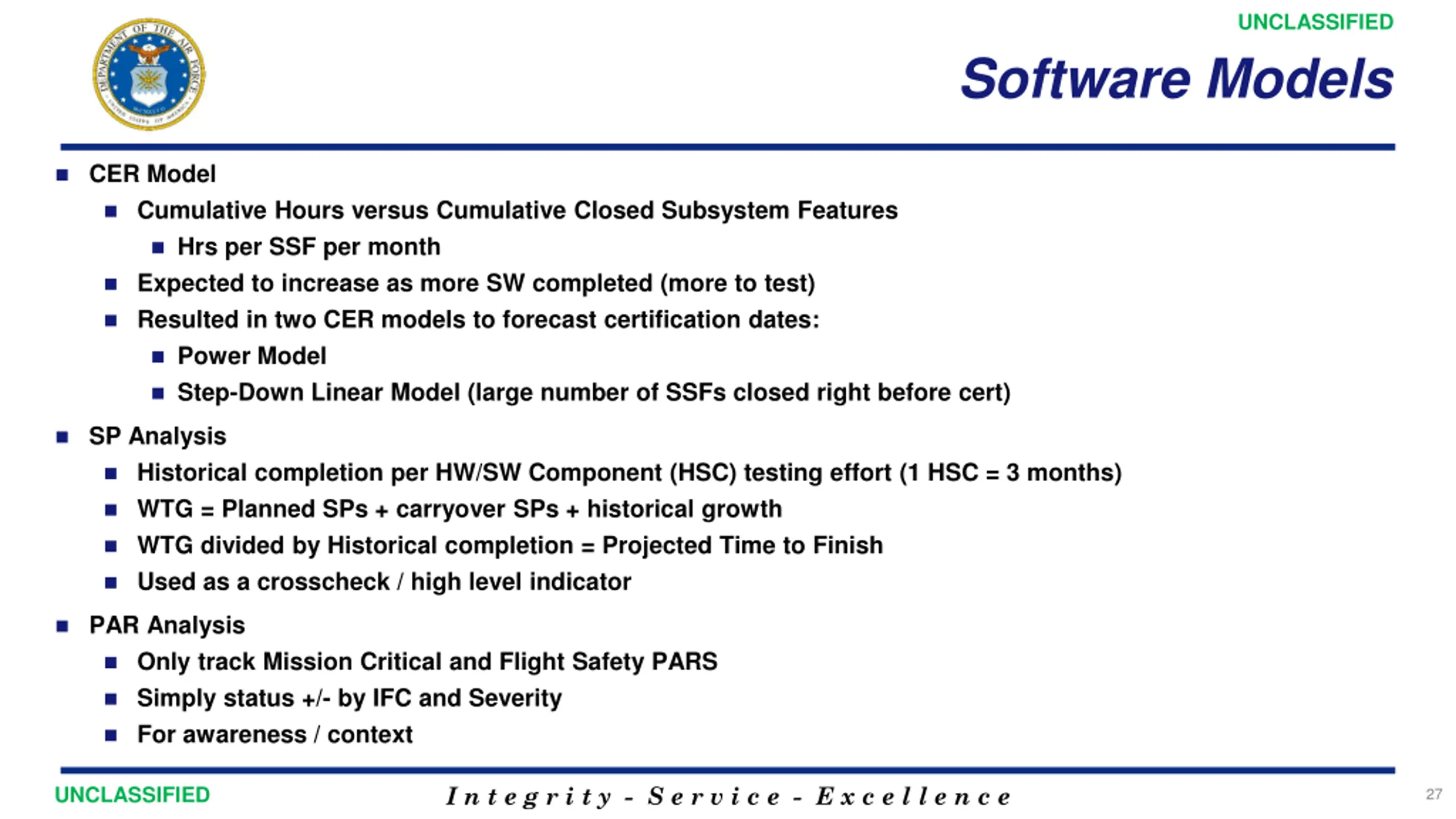 UNCLASSIFIED Software Models CER Model Cumulative Hours versus Cumulative Closed Subsystem Features Hrs per SSF per month Expected to increase as more SW completed (more to test) Resulted in two CER models to forecast certification dates: Power Model Step-Down Linear Model (large number of SSFs closed right before cert) SP Analysis Historical completion per HW/SW Component (HSC) testing effort (1 HSC = 3 months) WTG = Planned SPs + carryover SPs + historical growth WTG divided by Historical completion = Projected Time to Finish Used as a crosscheck / high level indicator PAR Analysis Only track Mission Critical and Flight Safety PARS Simply status +/- by IFC and Severity For awareness / context I n t e g r i t y - S e r v i c e - E x c e l l e n c e UNCLASSIFIED 27