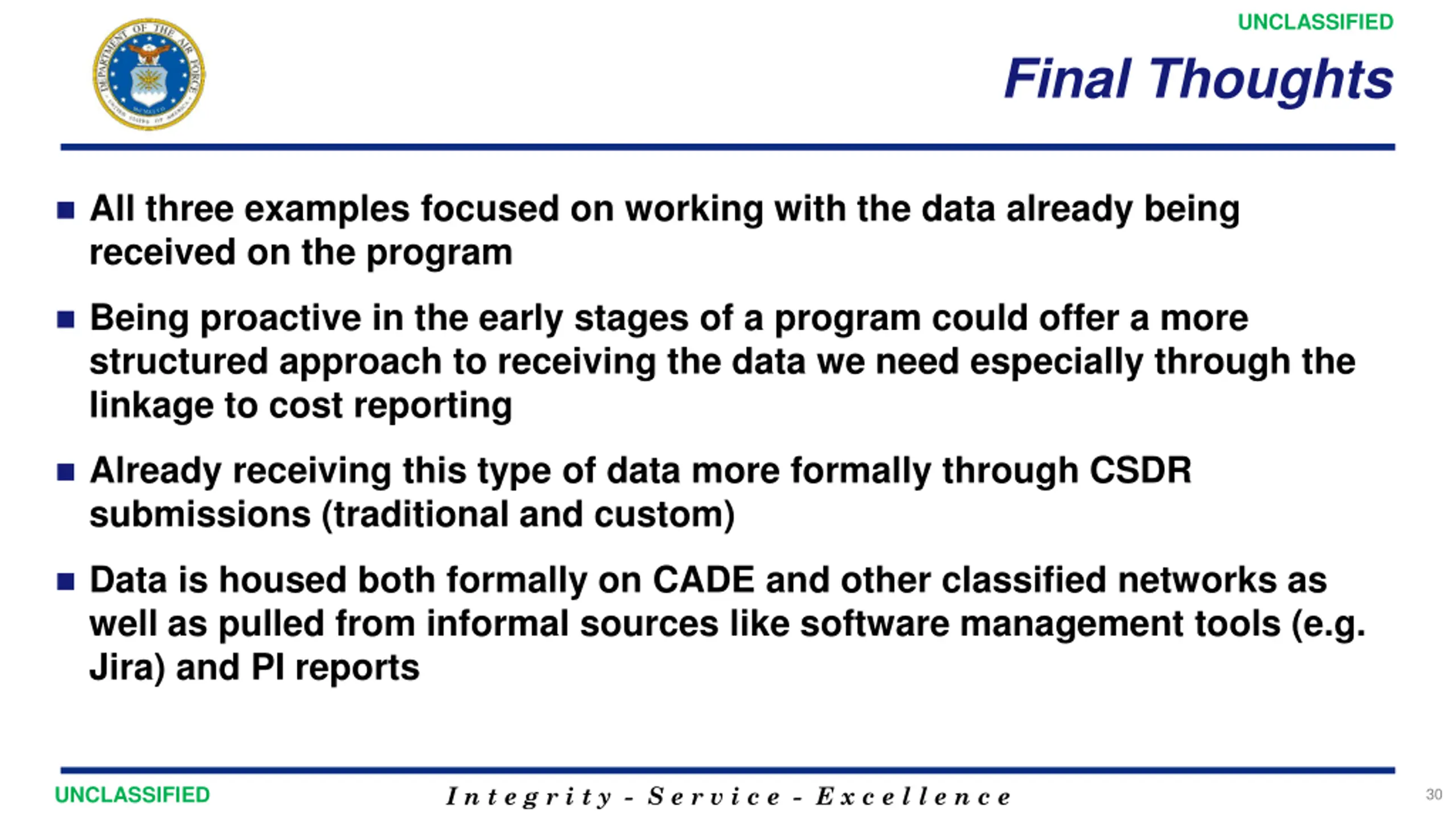 UNCLASSIFIED Final Thoughts All three examples focused on working with the data already being received on the program Being proactive in the early stages of a program could offer a more structured approach to receiving the data we need especially through the linkage to cost reporting Already receiving this type of data more formally through CSDR submissions (traditional and custom) Data is housed both formally on CADE and other classified networks as well as pulled from informal sources like software management tools (e.g. Jira) and PI reports I n t e g r i t y - S e r v i c e - E x c e l l e n c e UNCLASSIFIED 30