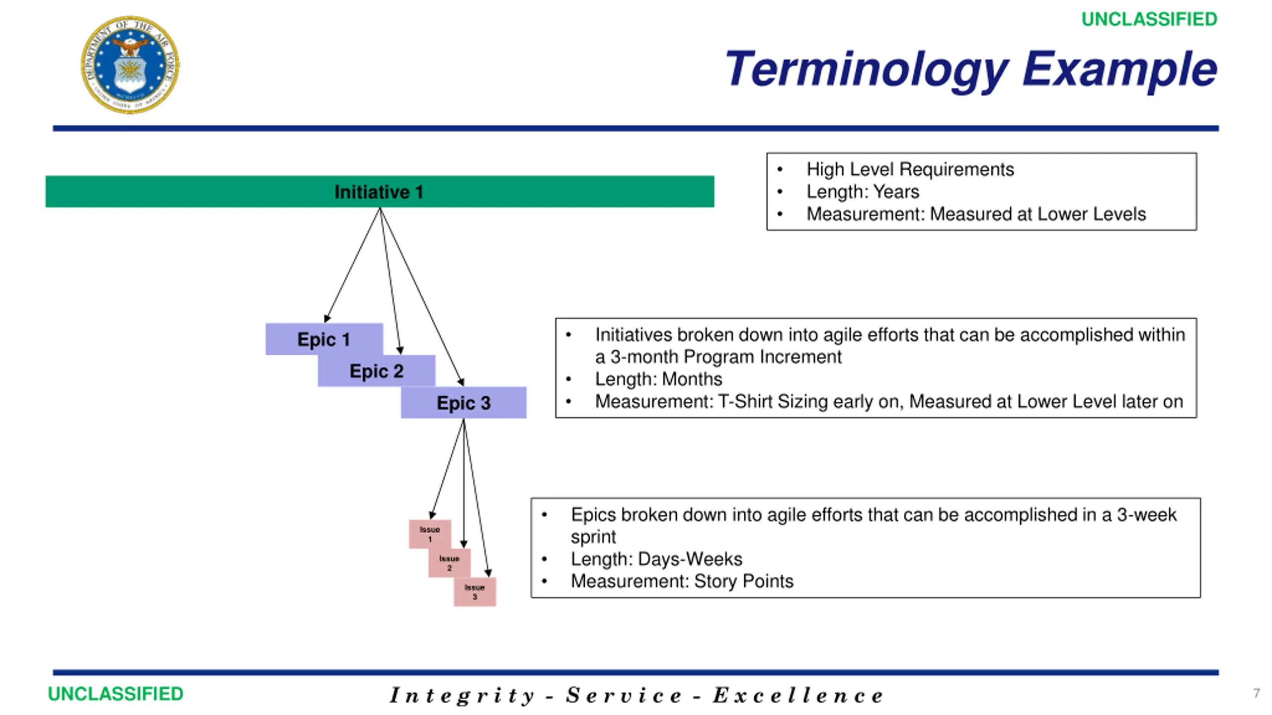 UNCLASSIFIED Terminology Example High Level Requirements Length: Years Measurement: Measured at Lower Levels Initiative 1 Initiatives broken down into agile efforts that can be accomplished within a 3-month Program Increment Length: Months Measurement: T-Shirt Sizing early on, Measured at Lower Level later on Epic 1 Epic 2 Epic 3 Epics broken down into agile efforts that can be accomplished in a 3-week sprint Length: Days-Weeks Measurement: Story Points Issue 1 Issue 2 Issue 3 I n t e g r i t y - S e r v i c e - E x c e l l e n c e UNCLASSIFIED 7