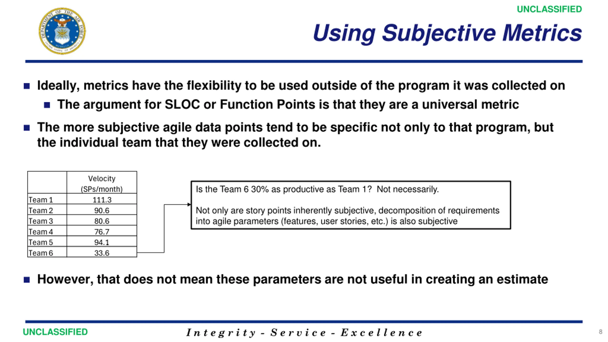 UNCLASSIFIED Using Subjective Metrics Ideally, metrics have the flexibility to be used outside of the program it was collected on The argument for SLOC or Function Points is that they are a universal metric The more subjective agile data points tend to be specific not only to that program, but the individual team that they were collected on. Velocity (SPs/month) 111.3 90.6 80.6 76.7 94.1 33.6 Is the Team 6 30% as productive as Team 1? Not necessarily. Team 1 Team 2 Team 3 Team 4 Team 5 Team 6 Not only are story points inherently subjective, decomposition of requirements into agile parameters (features, user stories, etc.) is also subjective However, that does not mean these parameters are not useful in creating an estimate I n t e g r i t y - S e r v i c e - E x c e l l e n c e UNCLASSIFIED 8