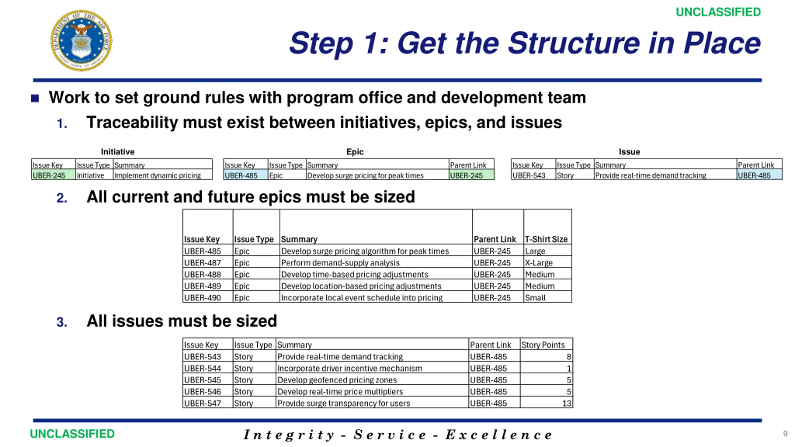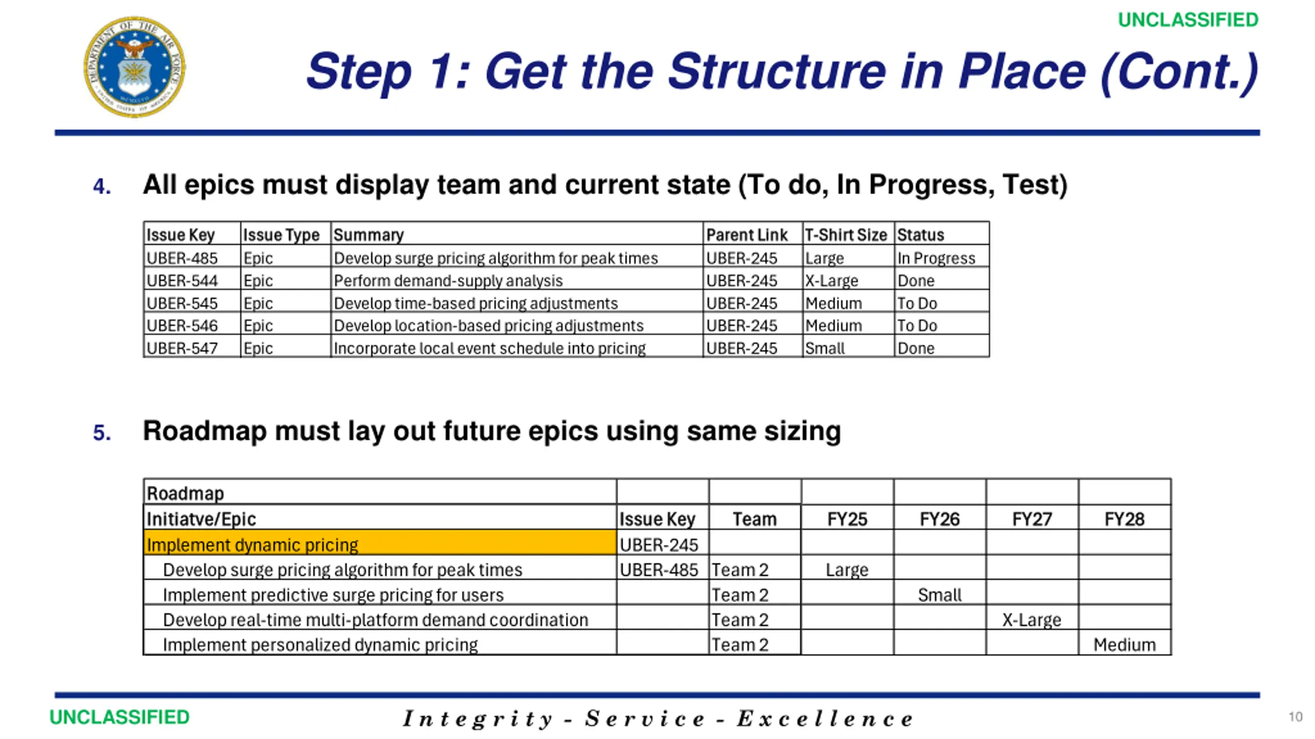UNCLASSIFIED Step 1: Get the Structure in Place (Cont.) All epics must display team and current state (To do, In Progress, Test) 4. Issue Key Issue Key UBER-485 UBER-544 UBER-545 UBER-546 UBER-547 Issue Type Issue Type Summary Epic Epic Epic Epic Epic Summary Develop surge pricing algorithm for peak times Perform demand-supply analysis Develop time-based pricing adjustments Develop location-based pricing adjustments Incorporate local event schedule into pricing Parent Link Parent Link UBER-245 UBER-245 UBER-245 UBER-245 UBER-245 T-Shirt Size T-Shirt Size Status Large X-Large Medium Medium Small Status In Progress Done To Do To Do Done Roadmap must lay out future epics using same sizing 5. Roadmap Roadmap Initiatve/Epic Initiatve/Epic Implement dynamic pricing Develop surge pricing algorithm for peak times Implement predictive surge pricing for users Develop real-time multi-platform demand coordination Implement personalized dynamic pricing Issue Key Issue Key UBER-245 UBER-485 Team 2 Team Team FY25 FY25 FY26 FY26 FY27 FY27 FY28 FY28 Large Team 2 Team 2 Team 2 Small X-Large Medium I n t e g r i t y - S e r v i c e - E x c e l l e n c e UNCLASSIFIED 10