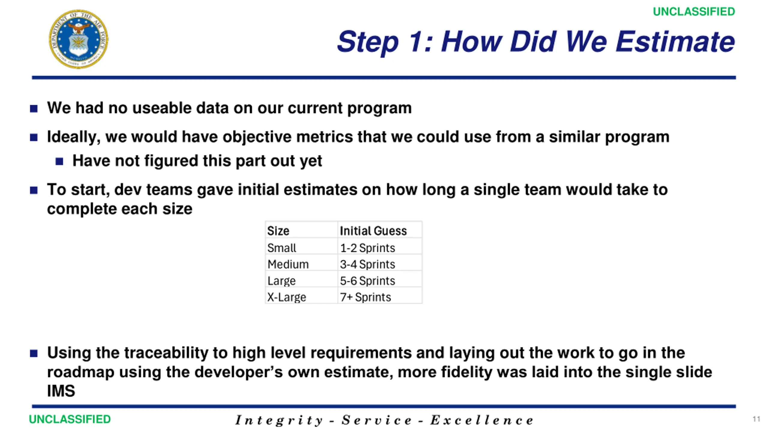 UNCLASSIFIED Step 1: How Did We Estimate We had no useable data on our current program Ideally, we would have objective metrics that we could use from a similar program Have not figured this part out yet To start, dev teams gave initial estimates on how long a single team would take to complete each size Size Size Initial Guess Initial Guess Small 1-2 Sprints Medium 3-4 Sprints Large 5-6 Sprints X-Large 7+ Sprints Using the traceability to high level requirements and laying out the work to go in the roadmap using the developer s own estimate, more fidelity was laid into the single slide IMS I n t e g r i t y - S e r v i c e - E x c e l l e n c e UNCLASSIFIED 11