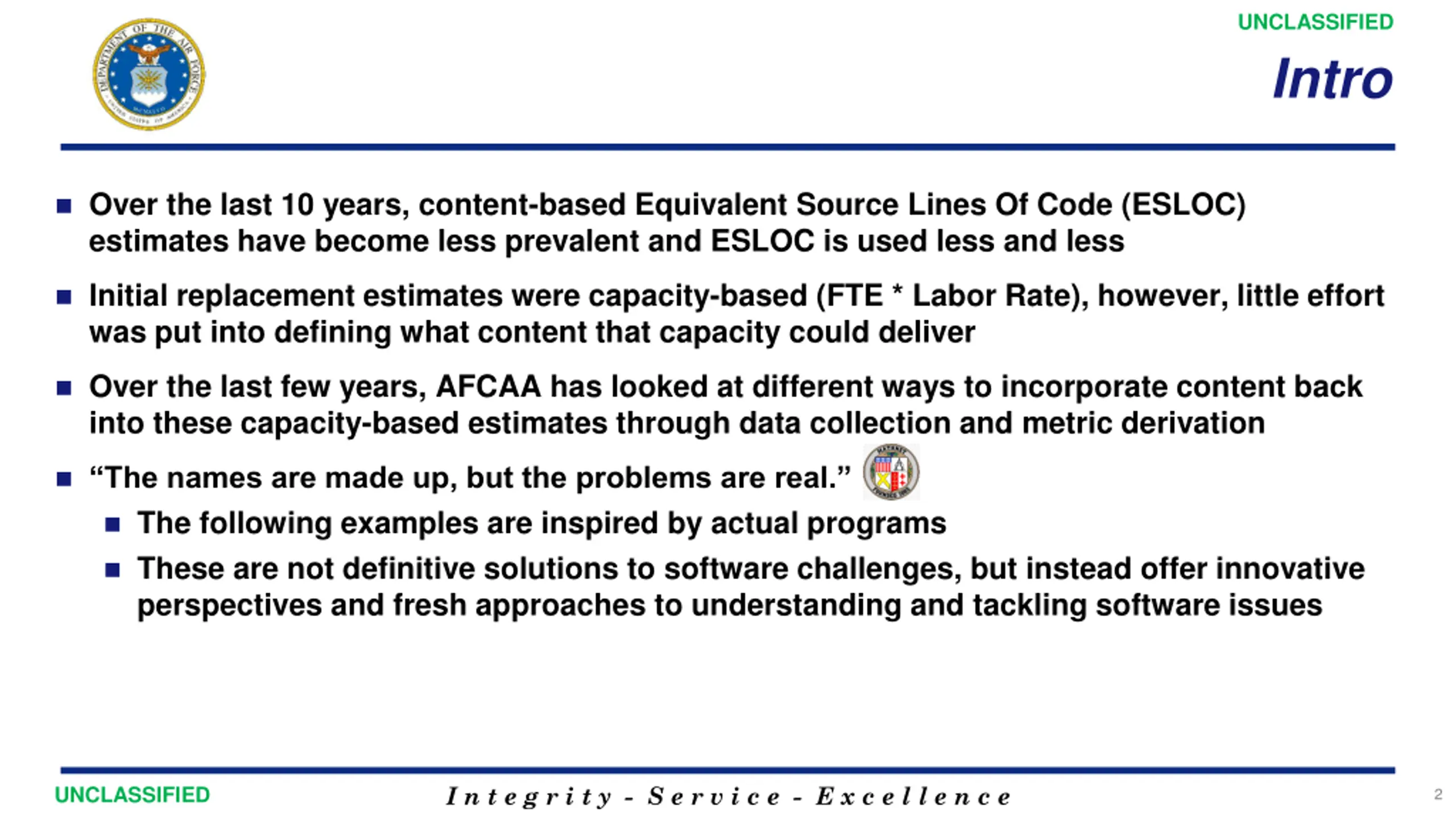UNCLASSIFIED Intro Over the last 10 years, content-based Equivalent Source Lines Of Code (ESLOC) estimates have become less prevalent and ESLOC is used less and less Initial replacement estimates were capacity-based (FTE * Labor Rate), however, little effort was put into defining what content that capacity could deliver Over the last few years, AFCAA has looked at different ways to incorporate content back into these capacity-based estimates through data collection and metric derivation The names are made up, but the problems are real. The following examples are inspired by actual programs These are not definitive solutions to software challenges, but instead offer innovative perspectives and fresh approaches to understanding and tackling software issues I n t e g r i t y - S e r v i c e - E x c e l l e n c e UNCLASSIFIED 2