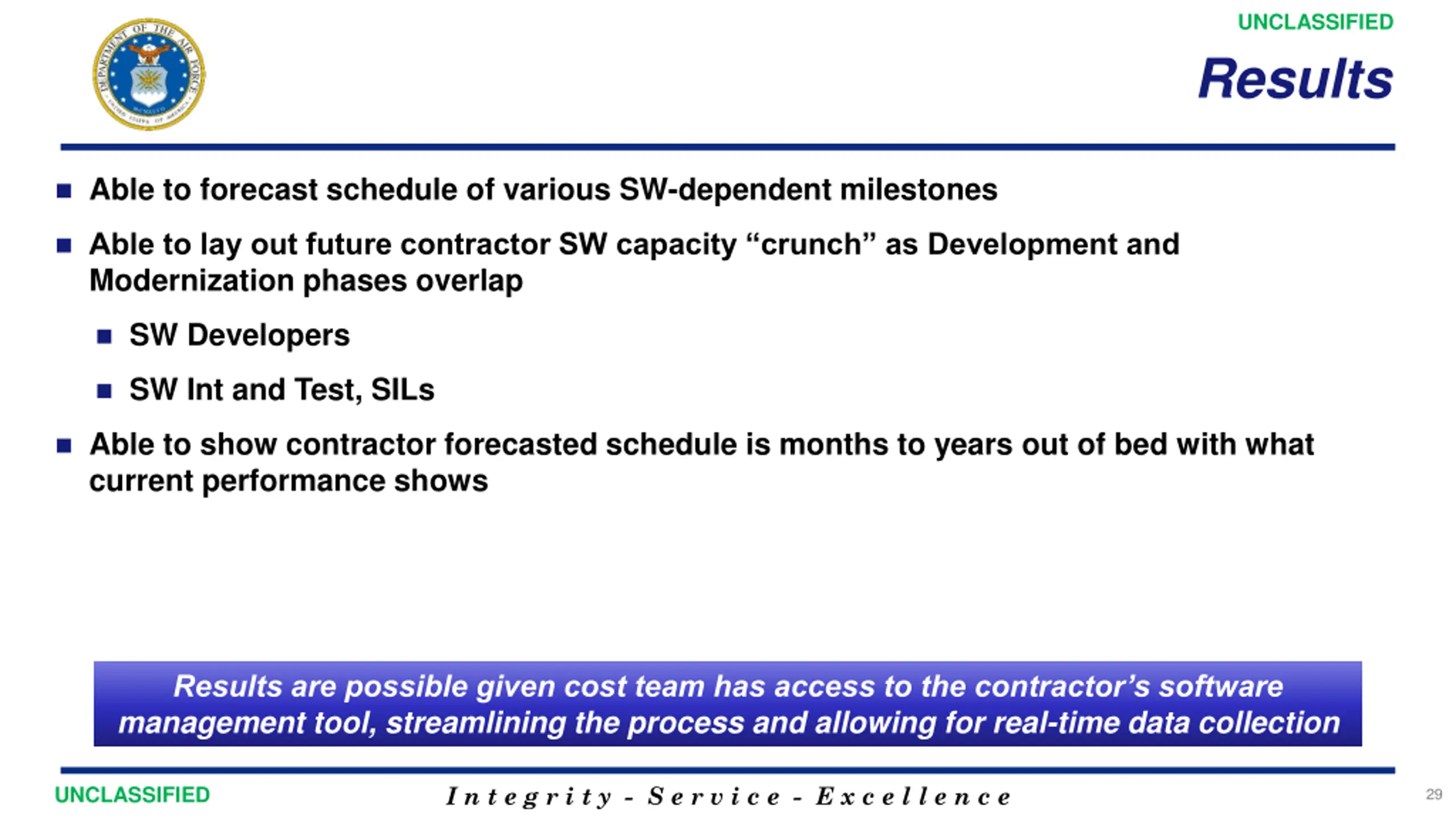UNCLASSIFIED Results Able to forecast schedule of various SW-dependent milestones Able to lay out future contractor SW capacity crunch as Development and Modernization phases overlap SW Developers SW Int and Test, SILs Able to show contractor forecasted schedule is months to years out of bed with what current performance shows Results are possible given cost team has access to the contractor s software management tool, streamlining the process and allowing for real-time data collection I n t e g r i t y - S e r v i c e - E x c e l l e n c e UNCLASSIFIED 29
