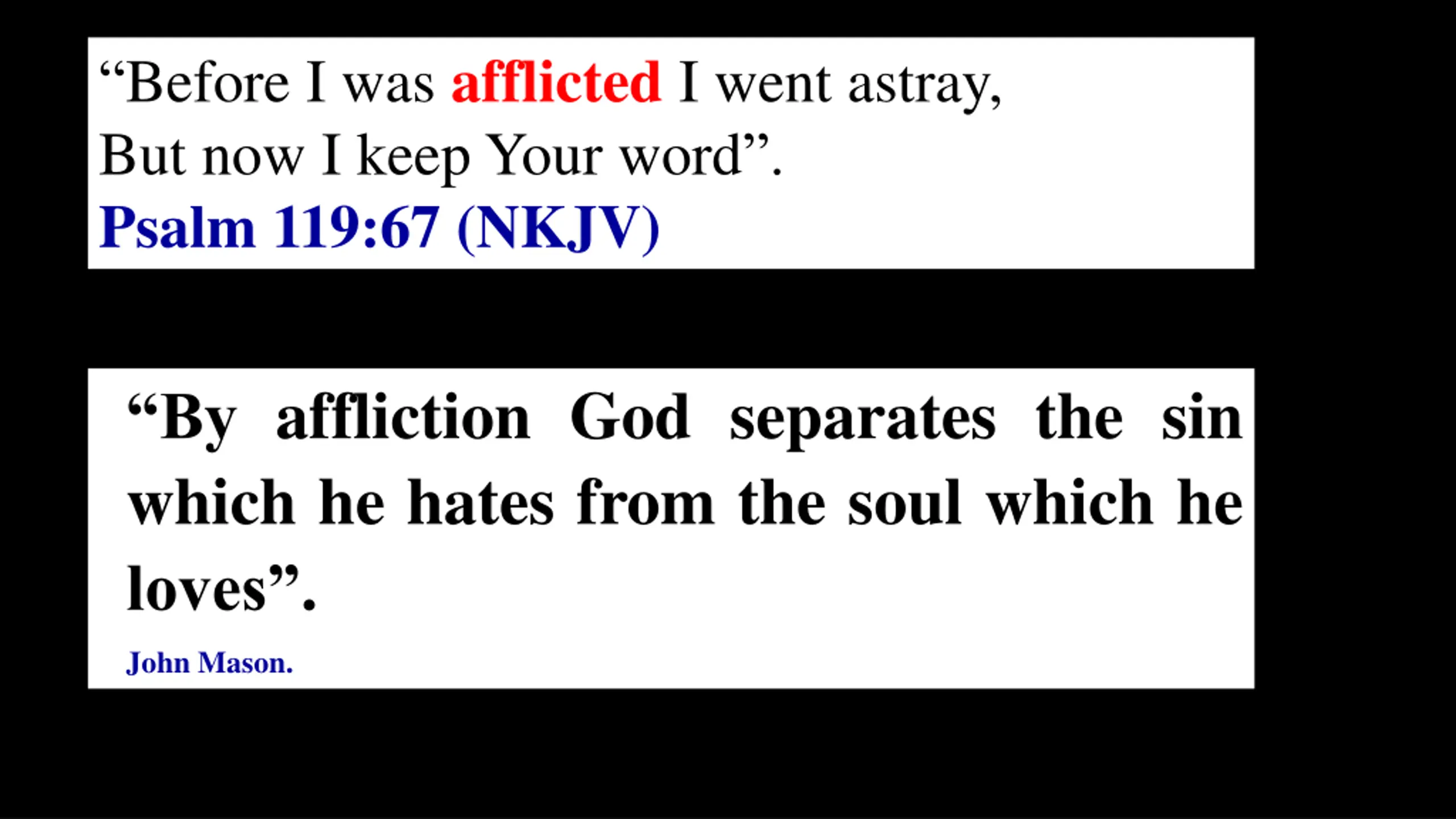 Before I was afflicted I went astray, But now I keep Your word . Psalm 119:67 (NKJV) By affliction God separates the sin which he hates from the soul which he loves . John Mason.