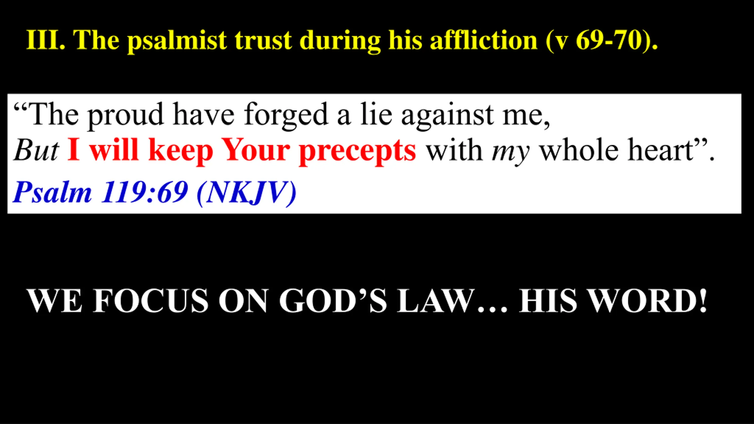 III. The psalmist trust during his affliction (v 69-70). The proud have forged a lie against me, ButI will keep Your precepts with mywhole heart . Psalm 119:69 (NKJV) WE FOCUS ON GOD S LAW HIS WORD!