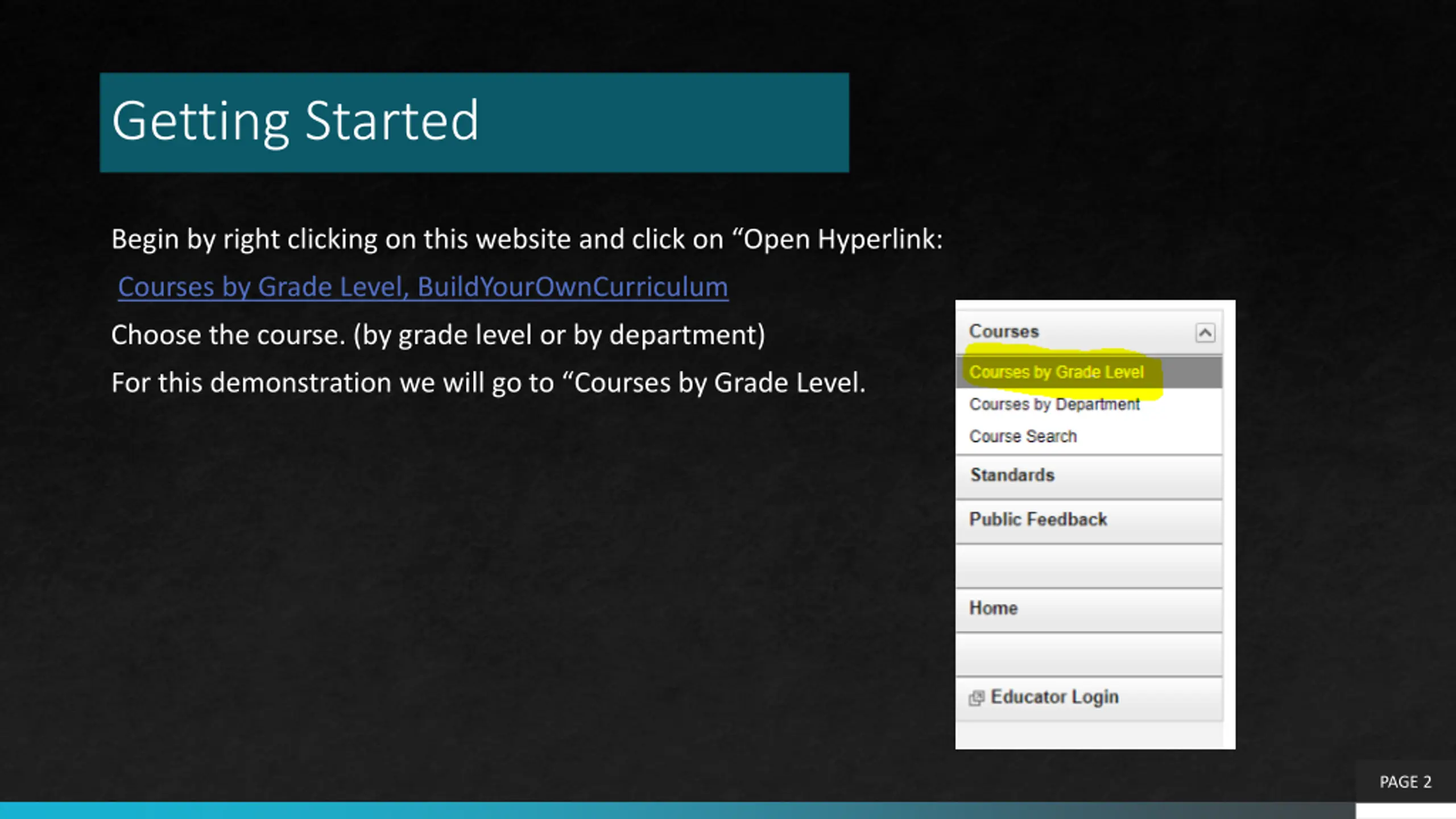 Getting Started Begin by right clicking on this website and click on Open Hyperlink: Courses by Grade Level, BuildYourOwnCurriculum Choose the course. (by grade level or by department) For this demonstration we will go to Courses by Grade Level. PAGE 2