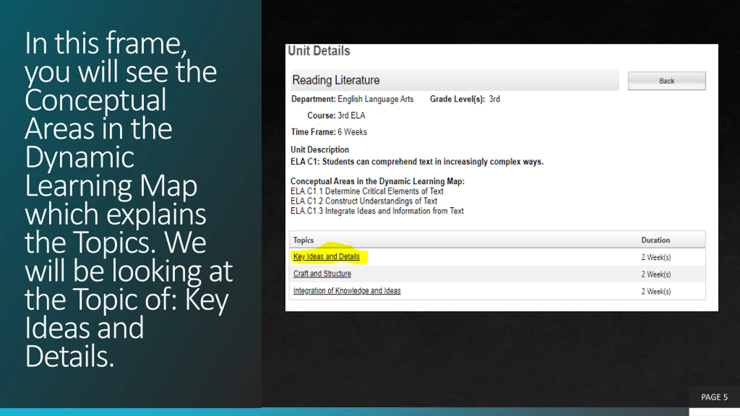 In this frame, you will see the Conceptual Areas in the Dynamic Learning Map which explains the Topics. We will be looking at the Topic of: Key Ideas and Details. PAGE 5