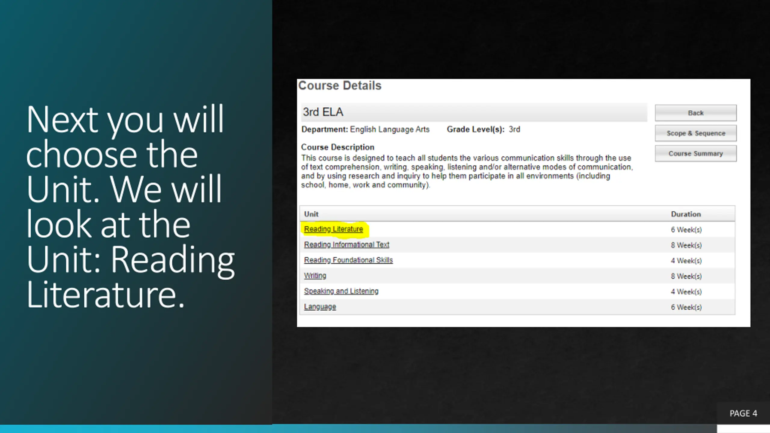 Next you will choose the Unit. We will look at the Unit: Reading Literature. PAGE 4