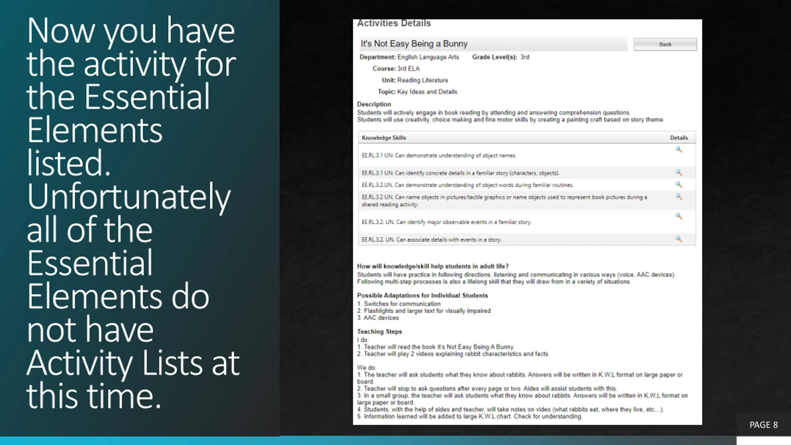 Now you have the activity for the Essential Elements listed. Unfortunately all of the Essential Elements do not have Activity Lists at this time. PAGE 8