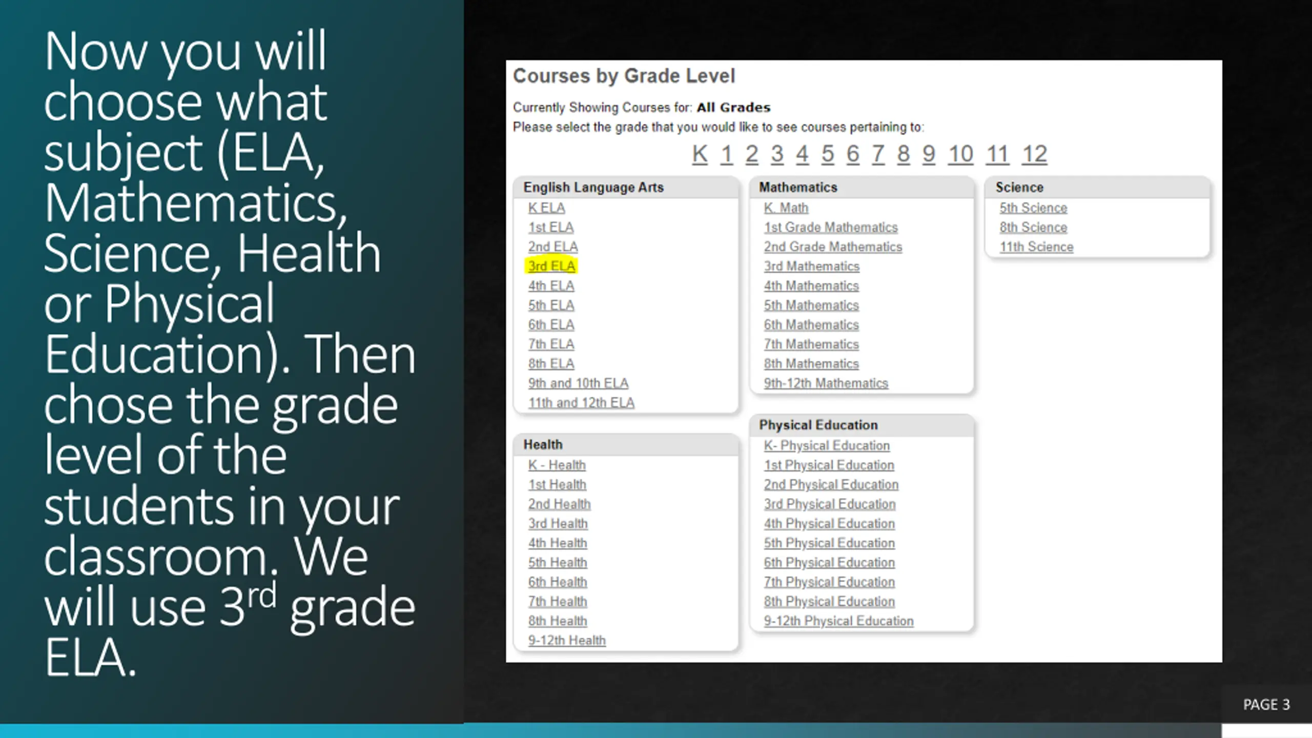 Now you will choose what subject (ELA, Mathematics, Science, Health or Physical Education). Then chose the grade level of the students in your classroom. We will use 3rd grade ELA. PAGE 3