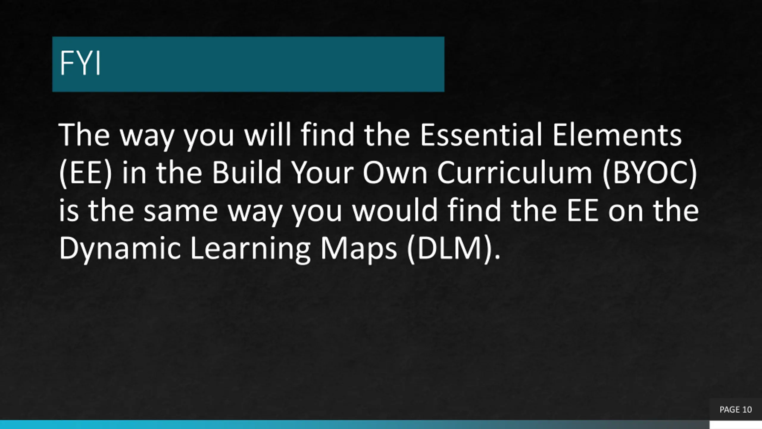 FYI The way you will find the Essential Elements (EE) in the Build Your Own Curriculum (BYOC) is the same way you would find the EE on the Dynamic Learning Maps (DLM). PAGE 10