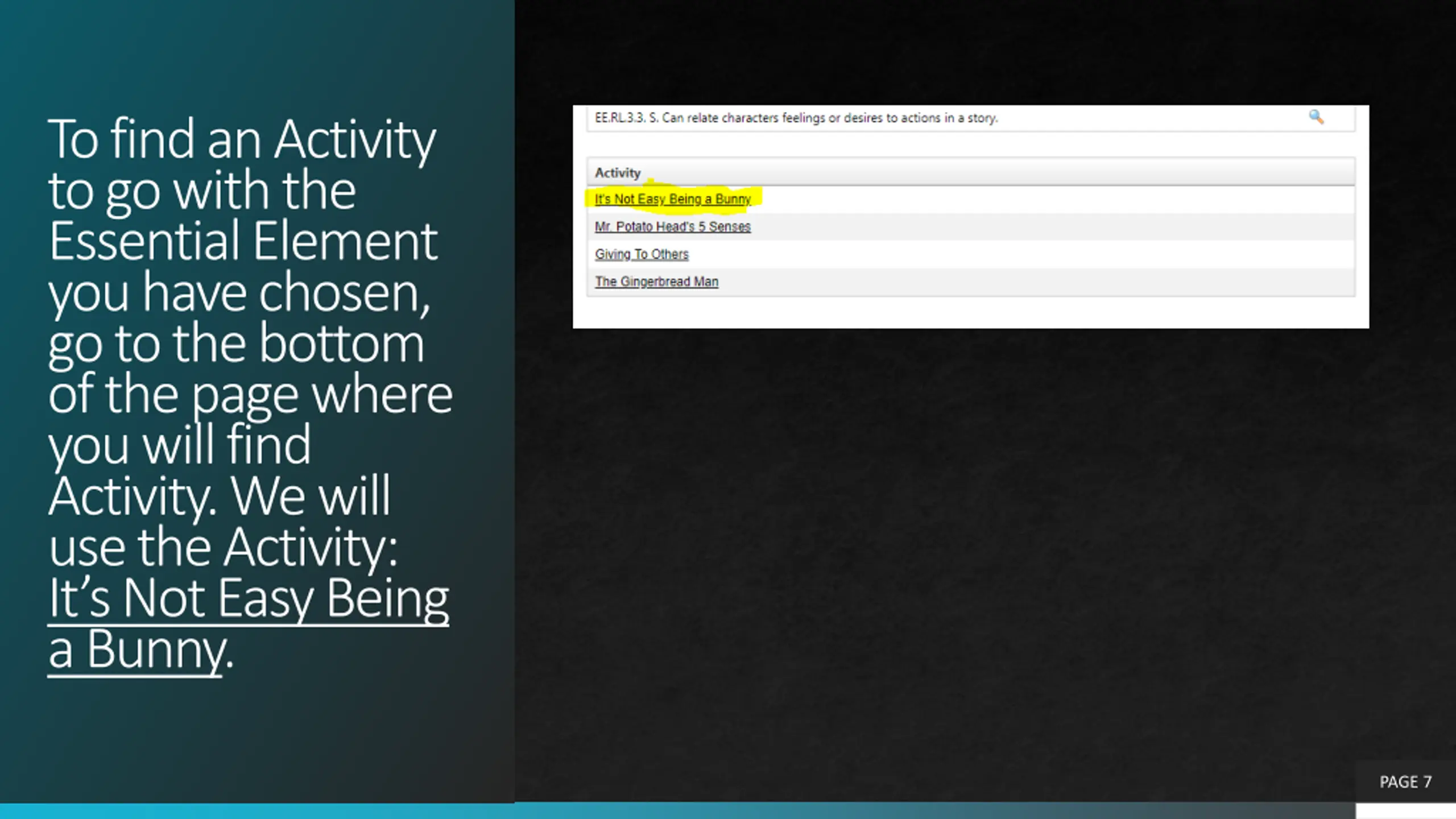To find an Activity to go with the Essential Element you have chosen, go to the bottom of the page where you will find Activity. We will use the Activity: It s Not Easy Being a Bunny. PAGE 7