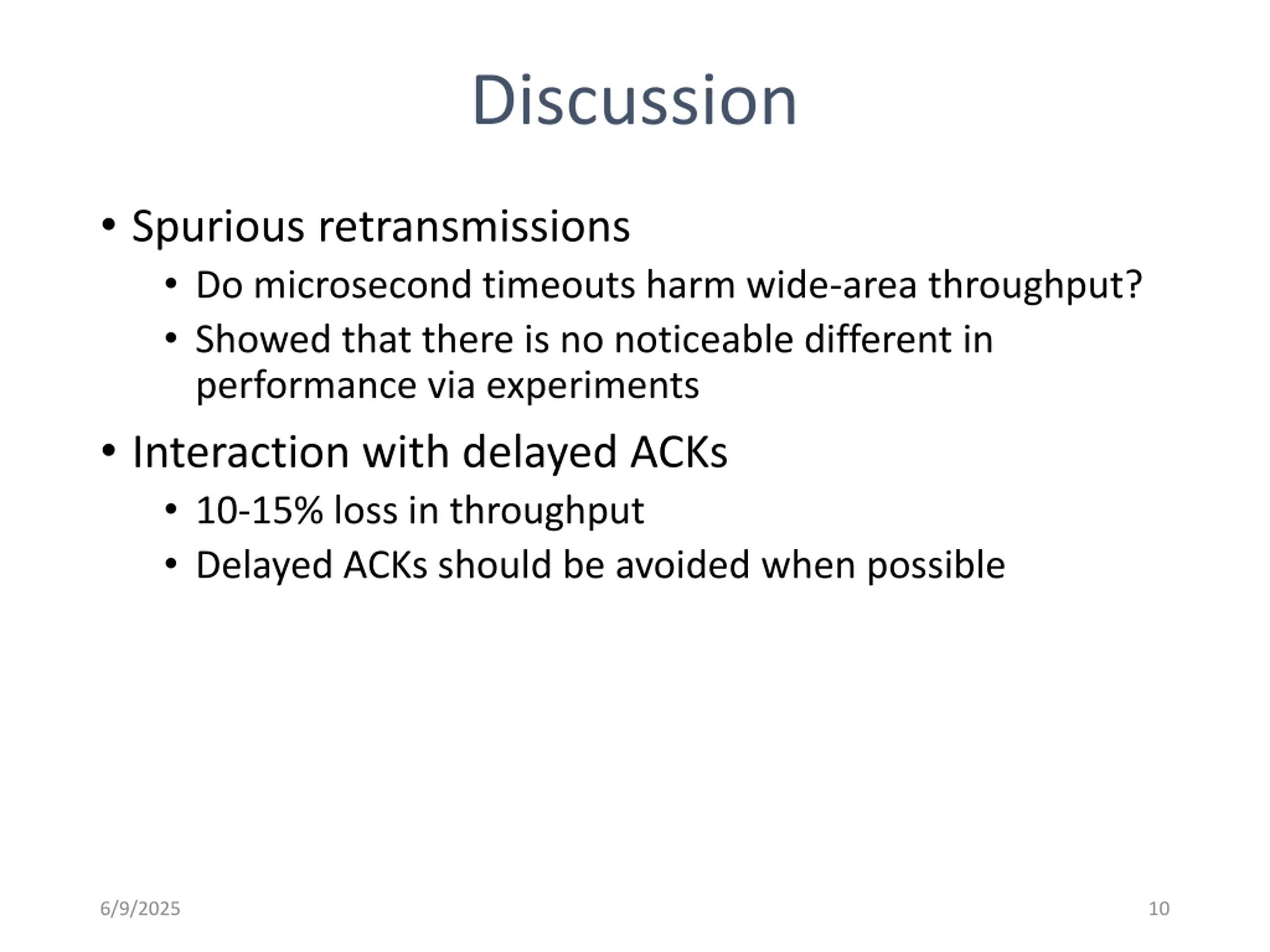 Discussion Spurious retransmissions Do microsecond timeouts harm wide-area throughput? Showed that there is no noticeable different in performance via experiments Interaction with delayed ACKs 10-15% loss in throughput Delayed ACKs should be avoided when possible 6/9/2025 10