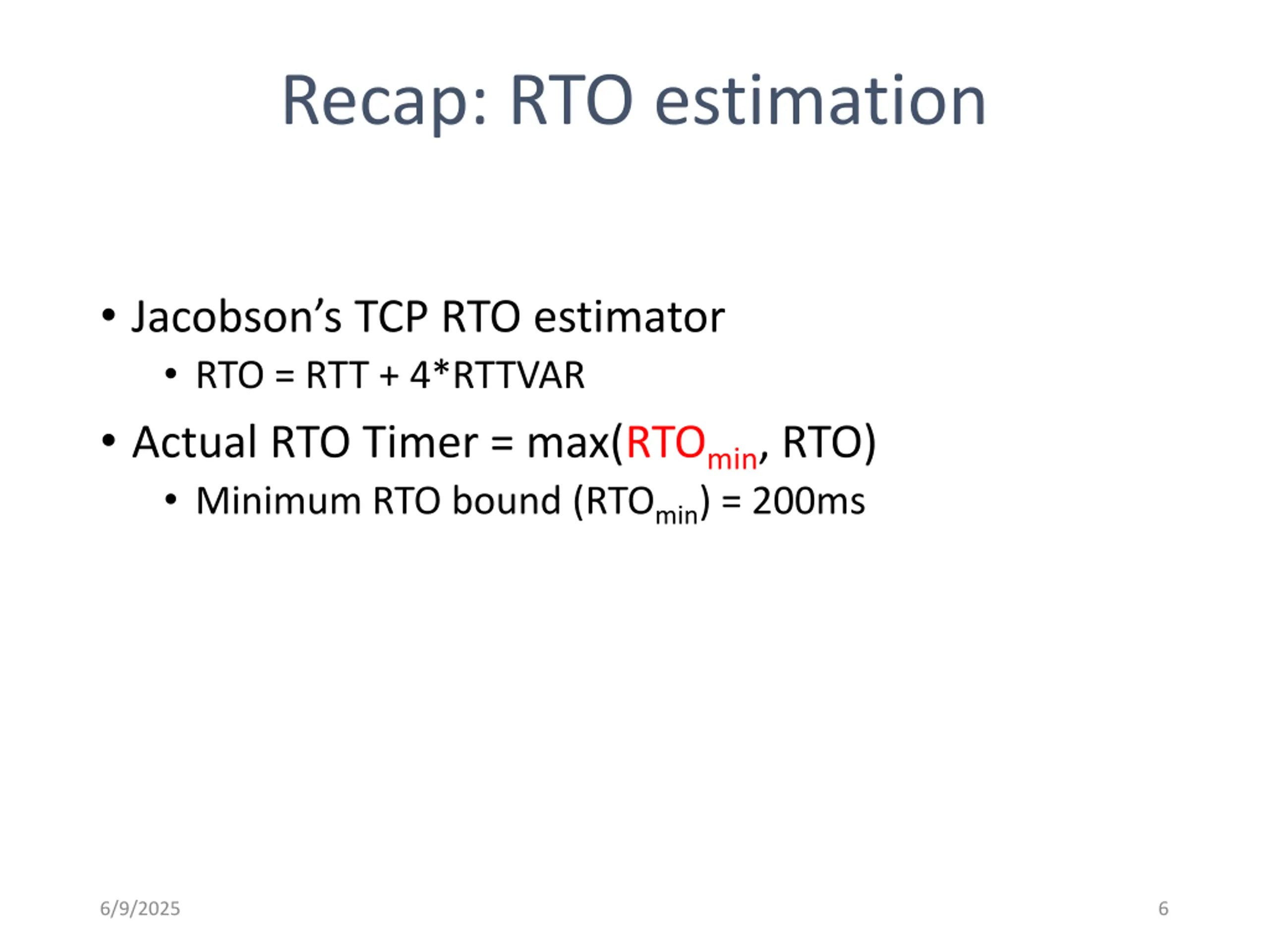 Recap: RTO estimation Jacobson s TCP RTO estimator RTO = RTT + 4*RTTVAR Actual RTO Timer = max(RTOmin, RTO) Minimum RTO bound (RTOmin) = 200ms 6/9/2025 6