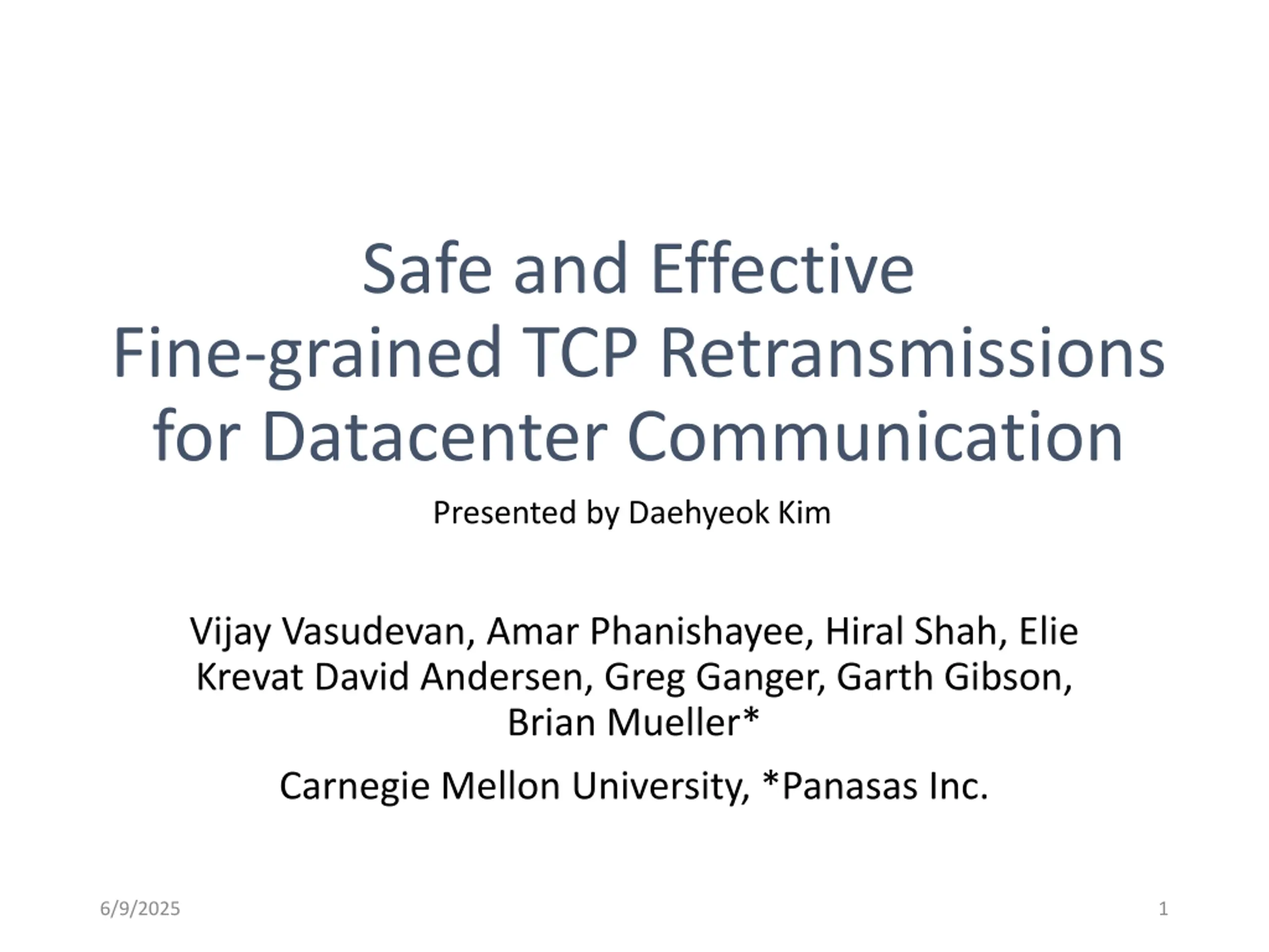 Safe and Effective Fine-grained TCP Retransmissions for Datacenter Communication Presented by Daehyeok Kim Vijay Vasudevan, Amar Phanishayee, Hiral Shah, Elie Krevat David Andersen, Greg Ganger, Garth Gibson, Brian Mueller* Carnegie Mellon University, *Panasas Inc. 6/9/2025 1