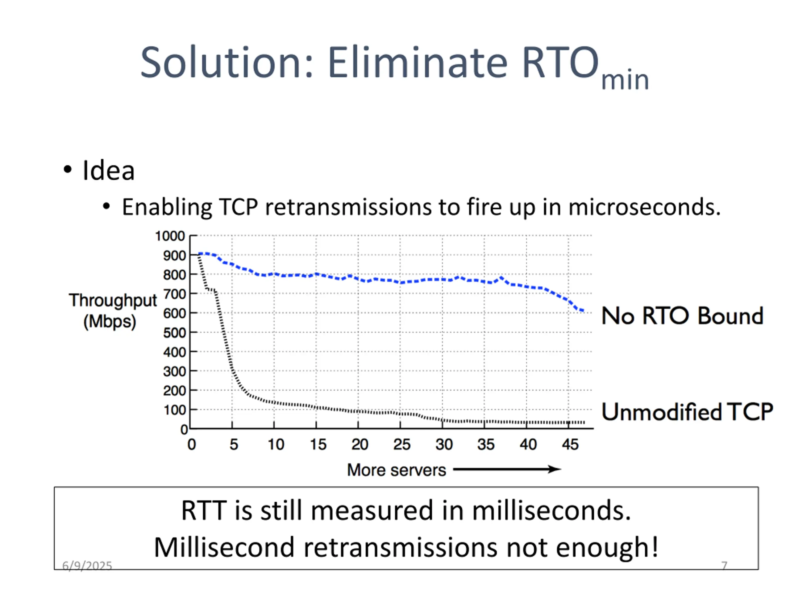 Solution: Eliminate RTOmin Idea Enabling TCP retransmissions to fire up in microseconds. RTT is still measured in milliseconds. Millisecond retransmissions not enough! 6/9/2025 7