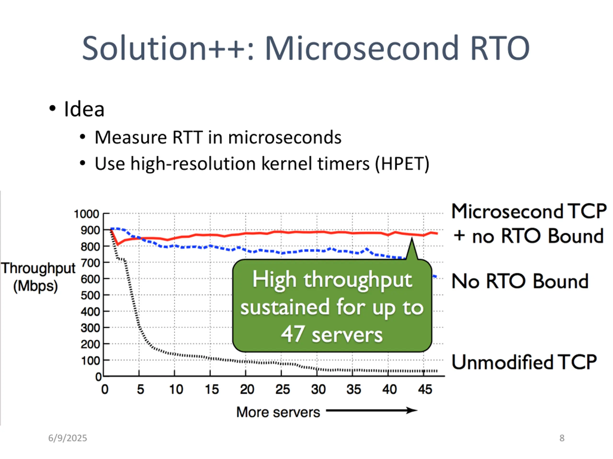 Preconditions for TCP Incast High-bandwidth, low-latency networks with small switch buffer. Clients issuing barrier-synchronized requests in parallel. Servers returning a relatively small amount of data per request. Root cause of incast: Imbalance between low link latency (us) and RTO (ms) 6/9/2025 3