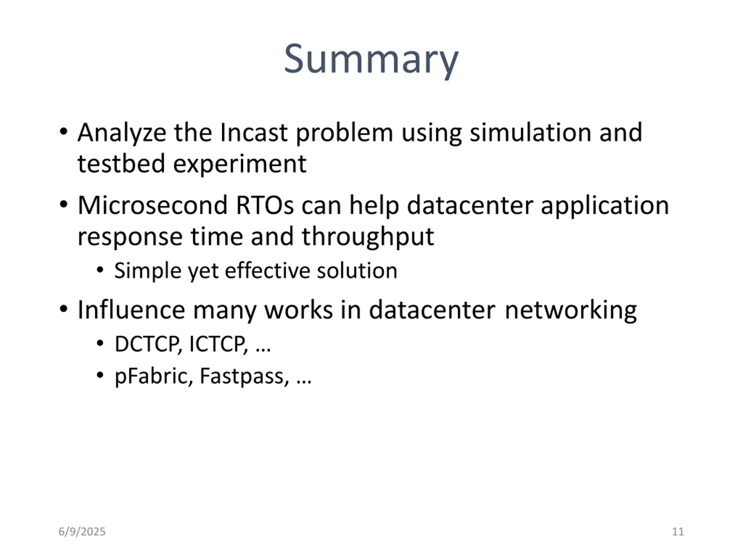 Summary Analyze the Incast problem using simulation and testbed experiment Microsecond RTOs can help datacenter application response time and throughput Simple yet effective solution Influence many works in datacenter networking DCTCP, ICTCP, pFabric, Fastpass, 6/9/2025 11