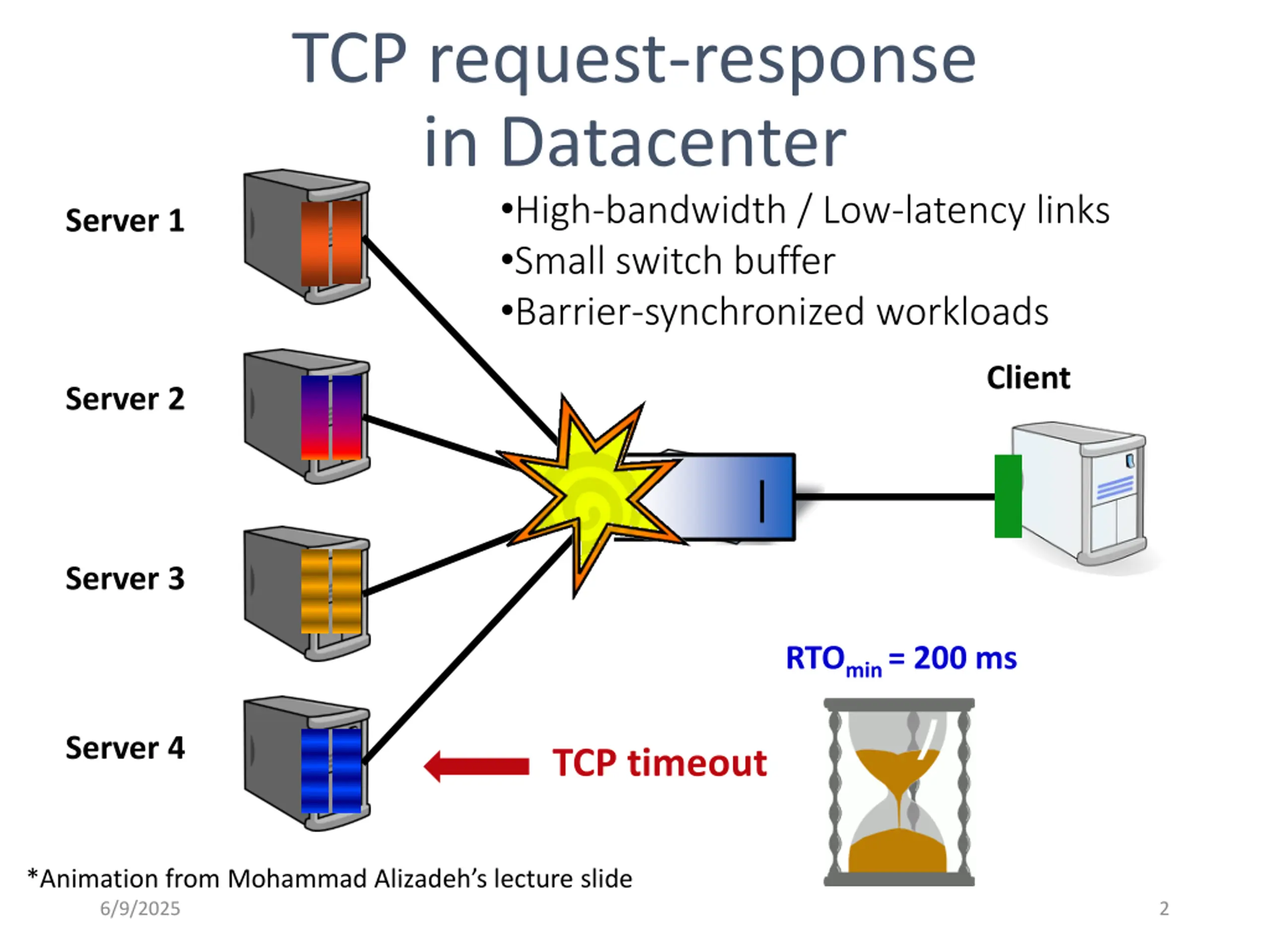 TCP request-response in Datacenter High-bandwidth / Low-latency links Small switch buffer Barrier-synchronized workloads Server 1 Client Server 2 Server 3 RTOmin = 200 ms Server 4 TCP timeout *Animation from Mohammad Alizadeh s lecture slide 6/9/2025 2