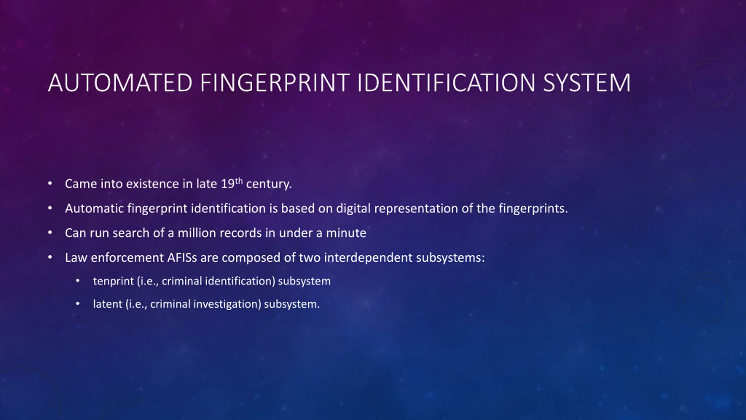 AUTOMATED FINGERPRINT IDENTIFICATION SYSTEM Came into existence in late 19th century. Automatic fingerprint identification is based on digital representation of the fingerprints. Can run search of a million records in under a minute Law enforcement AFISs are composed of two interdependent subsystems: tenprint (i.e., criminal identification) subsystem latent (i.e., criminal investigation) subsystem.