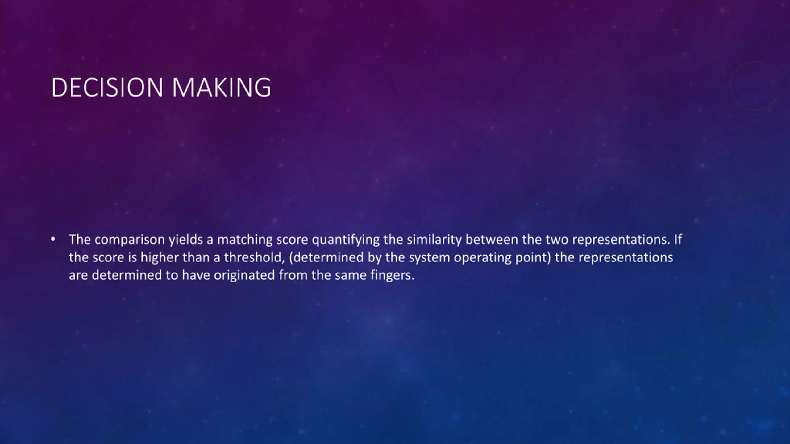 DECISION MAKING The comparison yields a matching score quantifying the similarity between the two representations. If the score is higher than a threshold, (determined by the system operating point) the representations are determined to have originated from the same fingers.