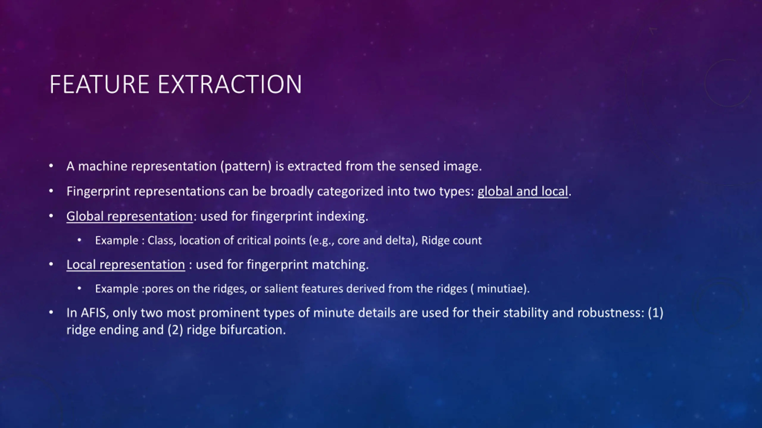 FEATURE EXTRACTION A machine representation (pattern) is extracted from the sensed image. Fingerprint representations can be broadly categorized into two types: global and local. Global representation: used for fingerprint indexing. Example : Class, location of critical points (e.g., core and delta), Ridge count Local representation : used for fingerprint matching. Example :pores on the ridges, or salient features derived from the ridges ( minutiae). In AFIS, only two most prominent types of minute details are used for their stability and robustness: (1) ridge ending and (2) ridge bifurcation.