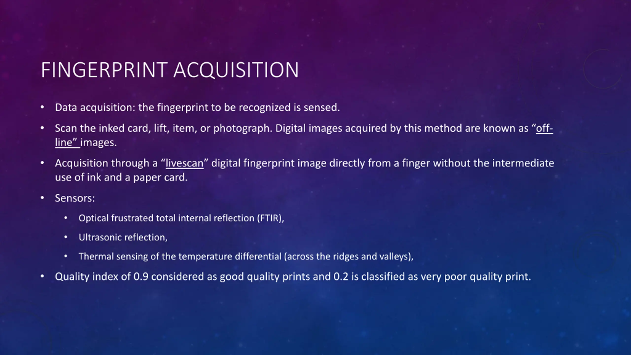 FINGERPRINT ACQUISITION Data acquisition: the fingerprint to be recognized is sensed. Scan the inked card, lift, item, or photograph. Digital images acquired by this method are known as off- line images. Acquisition through a livescan digital fingerprint image directly from a finger without the intermediate use of ink and a paper card. Sensors: Optical frustrated total internal reflection (FTIR), Ultrasonic reflection, Thermal sensing of the temperature differential (across the ridges and valleys), Quality index of 0.9 considered as good quality prints and 0.2 is classified as very poor quality print.