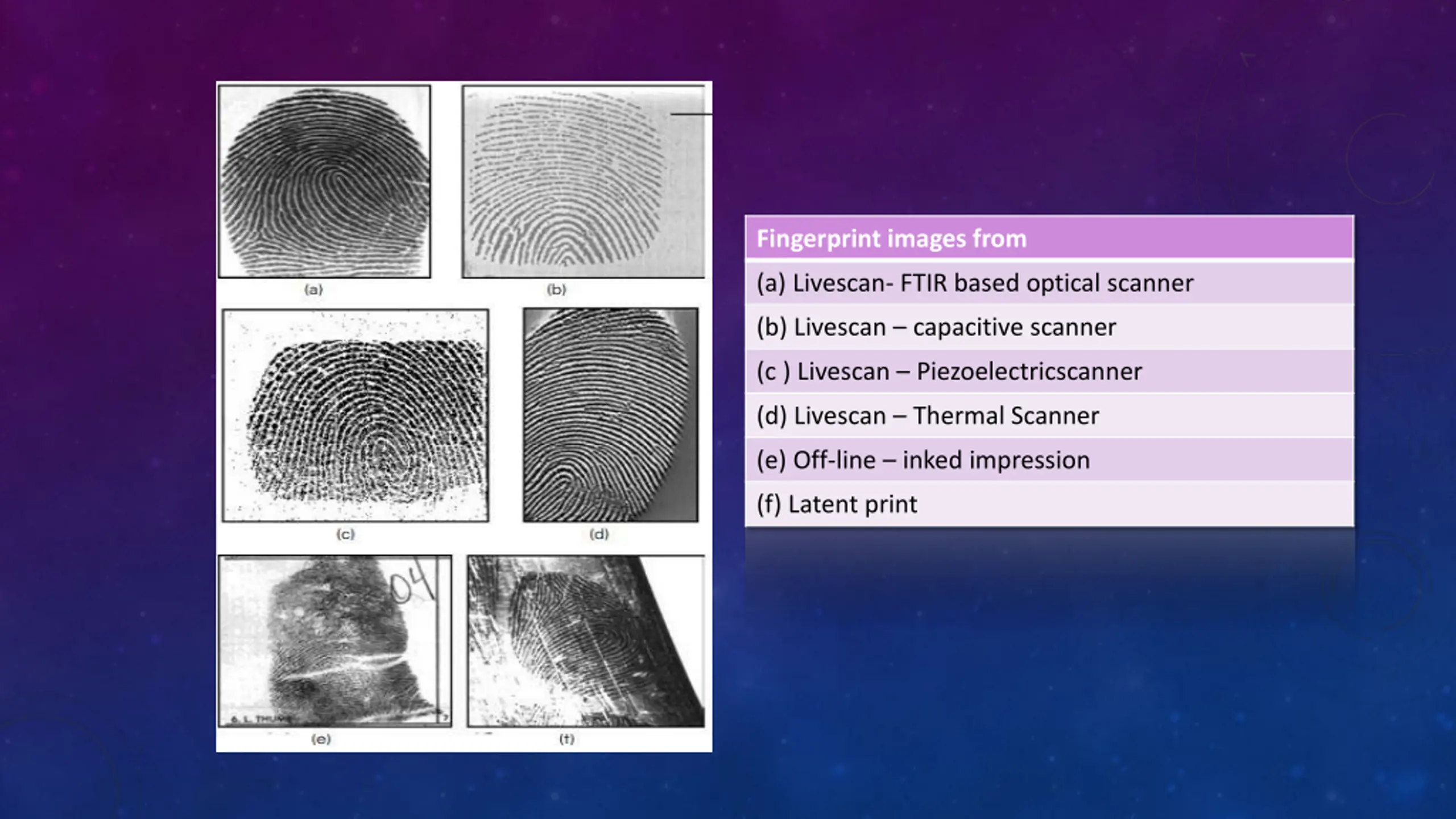 Fingerprint images from (a) Livescan- FTIR based optical scanner (b) Livescan capacitive scanner (c ) Livescan Piezoelectricscanner (d) Livescan Thermal Scanner (e) Off-line inked impression (f) Latent print