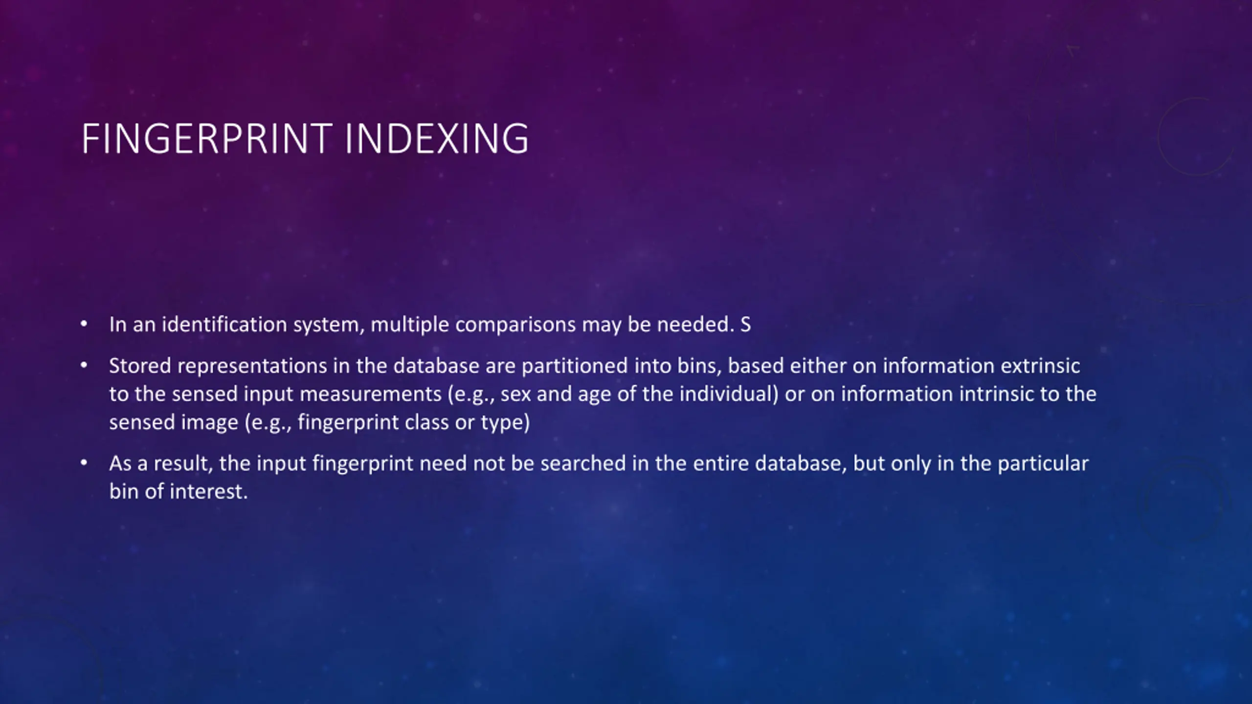 FINGERPRINT INDEXING In an identification system, multiple comparisons may be needed. S Stored representations in the database are partitioned into bins, based either on information extrinsic to the sensed input measurements (e.g., sex and age of the individual) or on information intrinsic to the sensed image (e.g., fingerprint class or type) As a result, the input fingerprint need not be searched in the entire database, but only in the particular bin of interest.