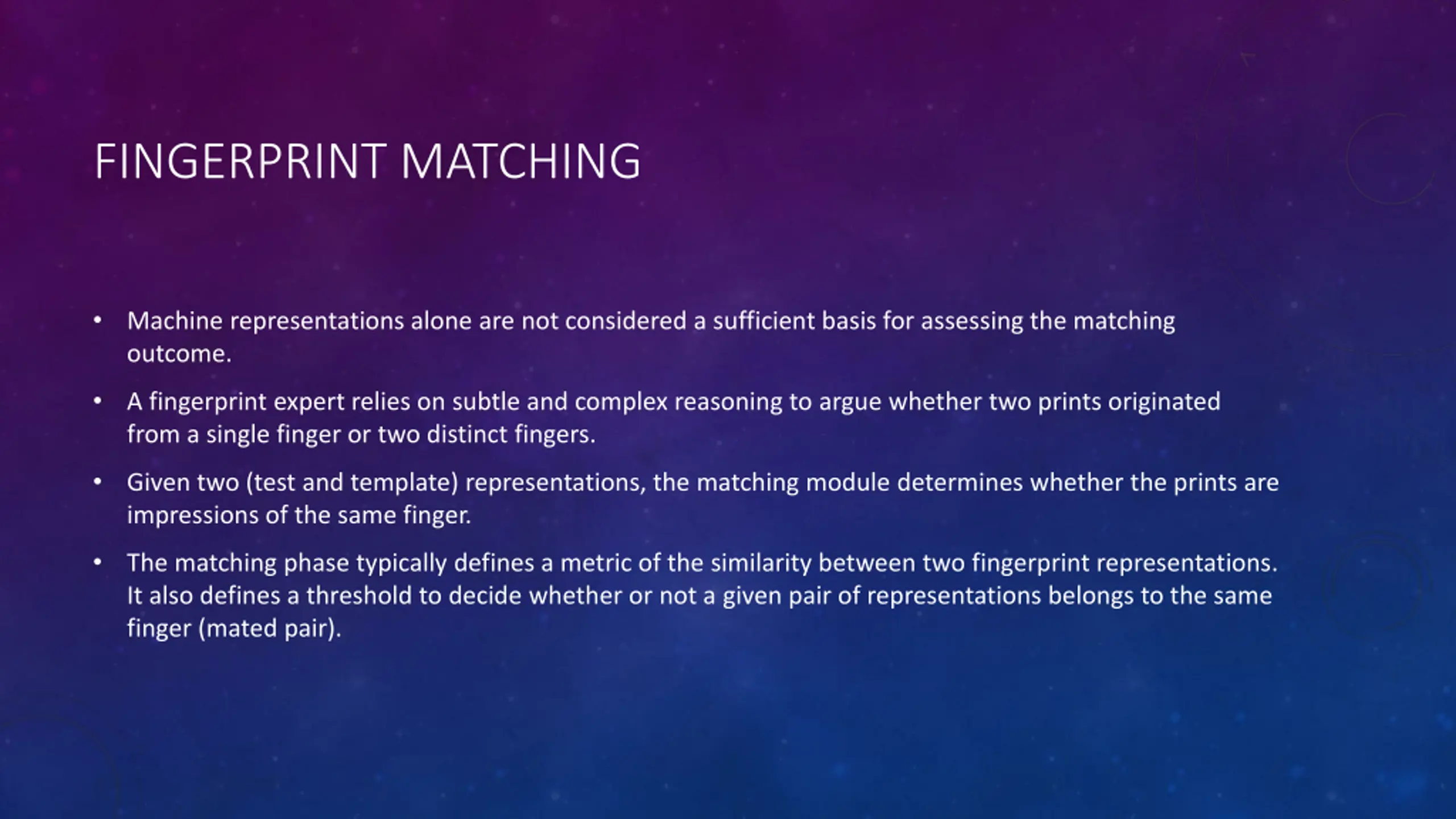 FINGERPRINT MATCHING Machine representations alone are not considered a sufficient basis for assessing the matching outcome. A fingerprint expert relies on subtle and complex reasoning to argue whether two prints originated from a single finger or two distinct fingers. Given two (test and template) representations, the matching module determines whether the prints are impressions of the same finger. The matching phase typically defines a metric of the similarity between two fingerprint representations. It also defines a threshold to decide whether or not a given pair of representations belongs to the same finger (mated pair).