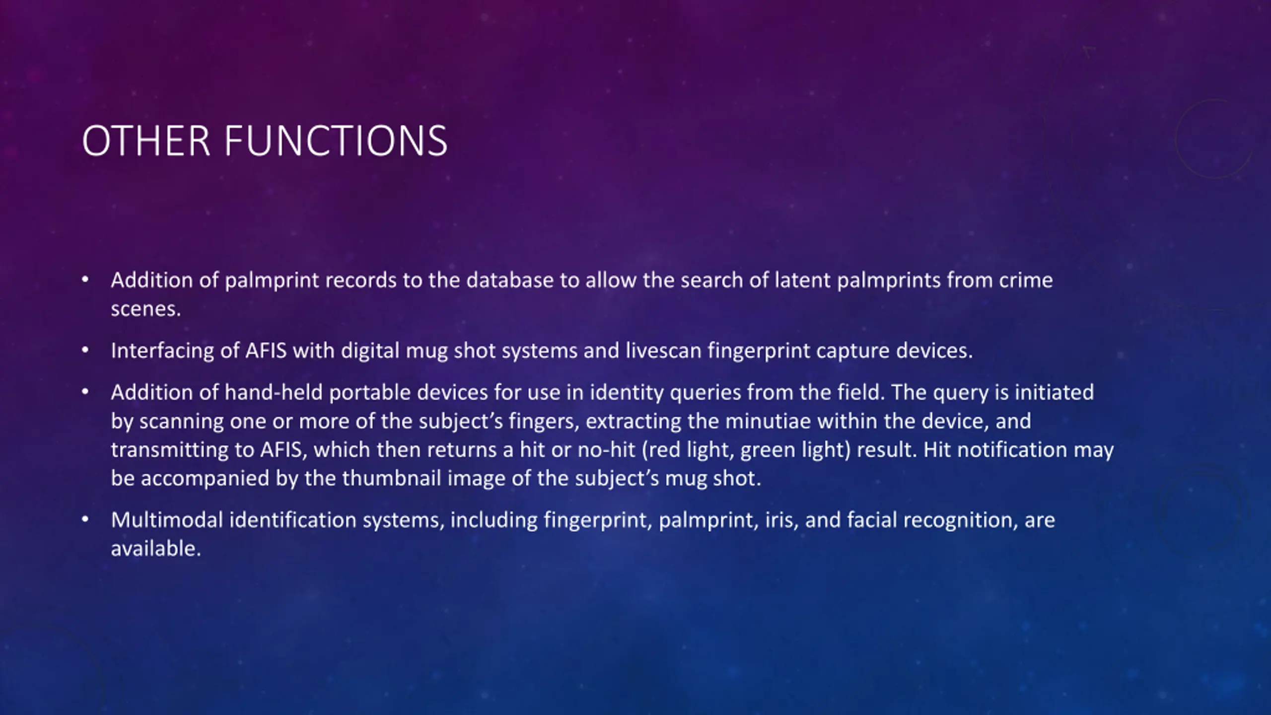 OTHER FUNCTIONS Addition of palmprint records to the database to allow the search of latent palmprints from crime scenes. Interfacing of AFIS with digital mug shot systems and livescan fingerprint capture devices. Addition of hand-held portable devices for use in identity queries from the field. The query is initiated by scanning one or more of the subject s fingers, extracting the minutiae within the device, and transmitting to AFIS, which then returns a hit or no-hit (red light, green light) result. Hit notification may be accompanied by the thumbnail image of the subject s mug shot. Multimodal identification systems, including fingerprint, palmprint, iris, and facial recognition, are available.