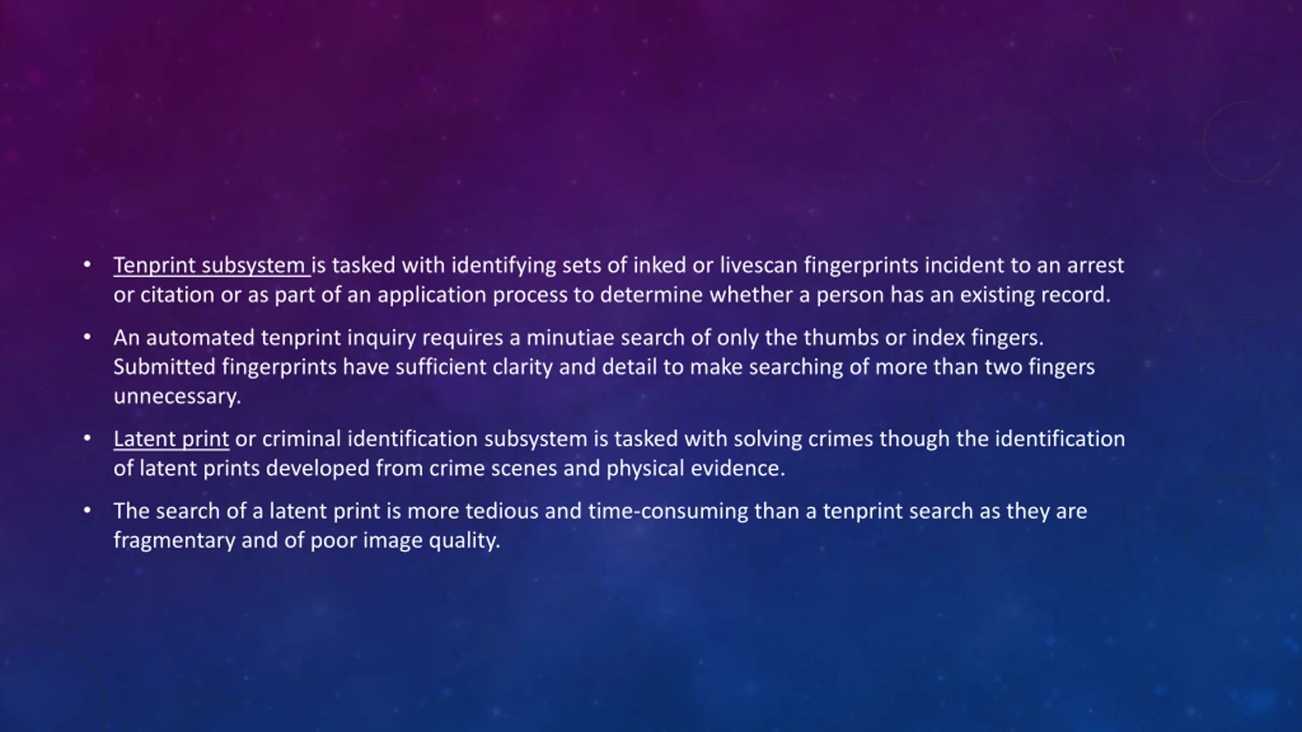 Tenprint subsystem is tasked with identifying sets of inked or livescan fingerprints incident to an arrest or citation or as part of an application process to determine whether a person has an existing record. An automated tenprint inquiry requires a minutiae search of only the thumbs or index fingers. Submitted fingerprints have sufficient clarity and detail to make searching of more than two fingers unnecessary. Latent print or criminal identification subsystem is tasked with solving crimes though the identification of latent prints developed from crime scenes and physical evidence. The search of a latent print is more tedious and time-consuming than a tenprint search as they are fragmentary and of poor image quality.