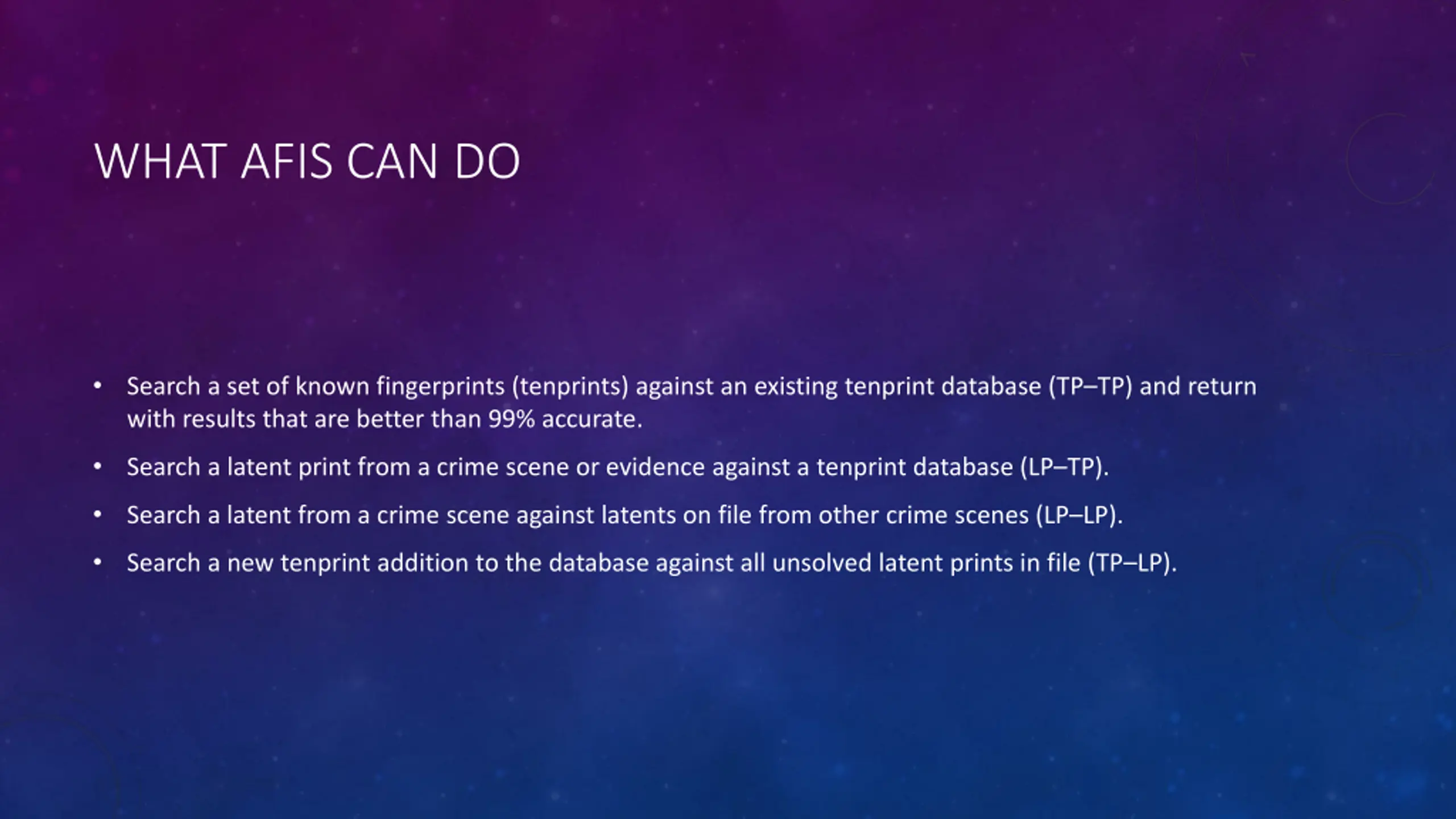 WHAT AFIS CAN DO Search a set of known fingerprints (tenprints) against an existing tenprint database (TP TP) and return with results that are better than 99% accurate. Search a latent print from a crime scene or evidence against a tenprint database (LP TP). Search a latent from a crime scene against latents on file from other crime scenes (LP LP). Search a new tenprint addition to the database against all unsolved latent prints in file (TP LP).