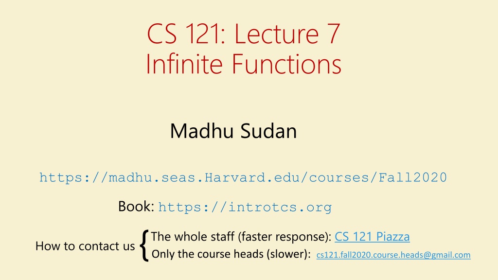 CS 121: Lecture 7 Infinite Functions Madhu Sudan https://madhu.seas.Harvard.edu/courses/Fall2020 Book: https://introtcs.org { The whole staff (faster response): CS 121 Piazza How to contact us Only the course heads (slower): cs121.fall2020.course.heads@gmail.com