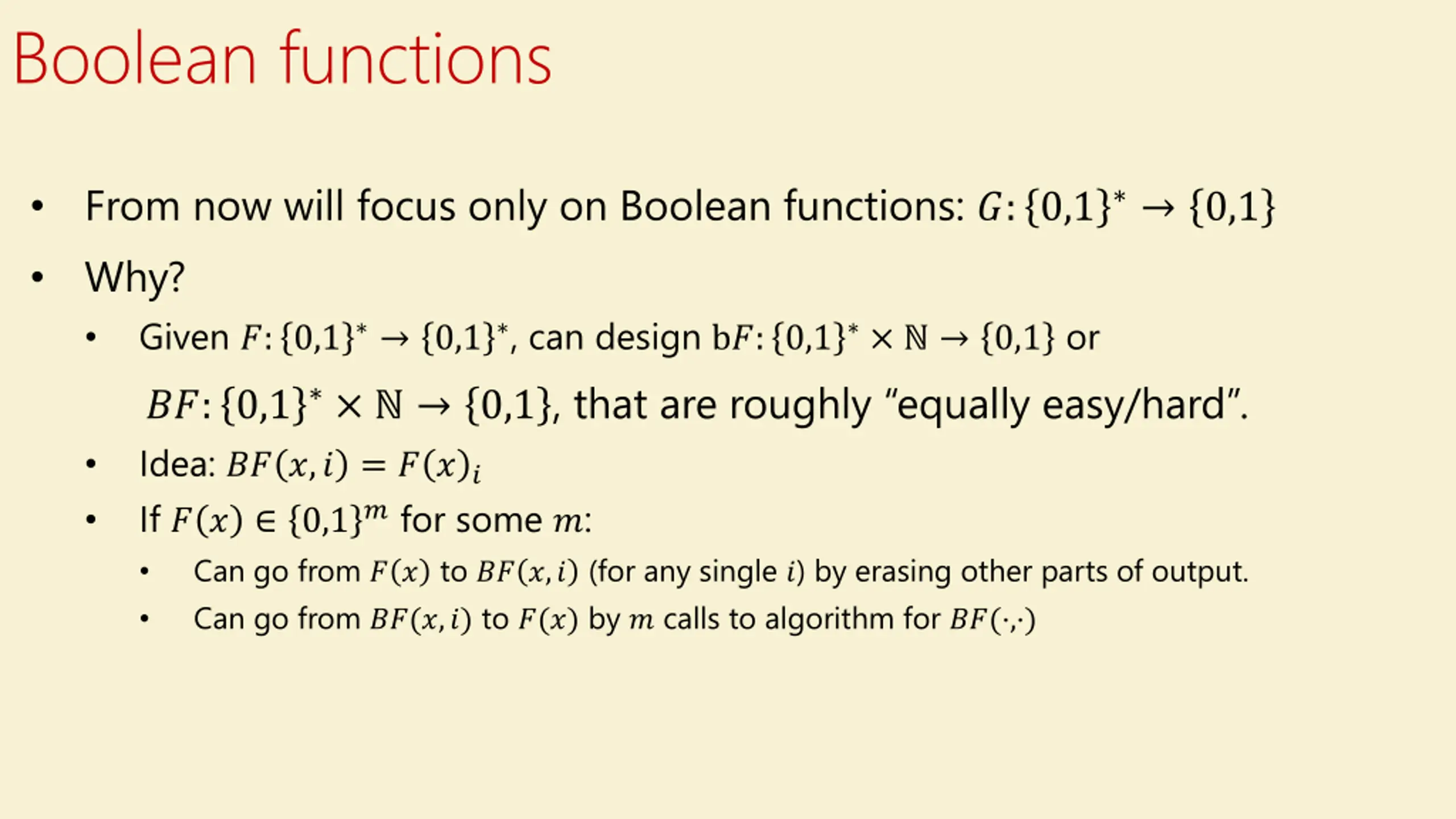 Boolean functions From now will focus only on Boolean functions: ?: 0,1 0,1 Why? Given ?: 0,1 0,1 , can design b?: 0,1 0,1 or ??: 0,1 0,1 , that are roughly equally easy/hard . Idea: ?? ?,? = ? ?? If ? ? 0,1? for some ?: Can go from ? ? to ?? ?,? (for any single ?) by erasing other parts of output. Can go from ??(?,?) to ?(?) by ? calls to algorithm for ??( , )