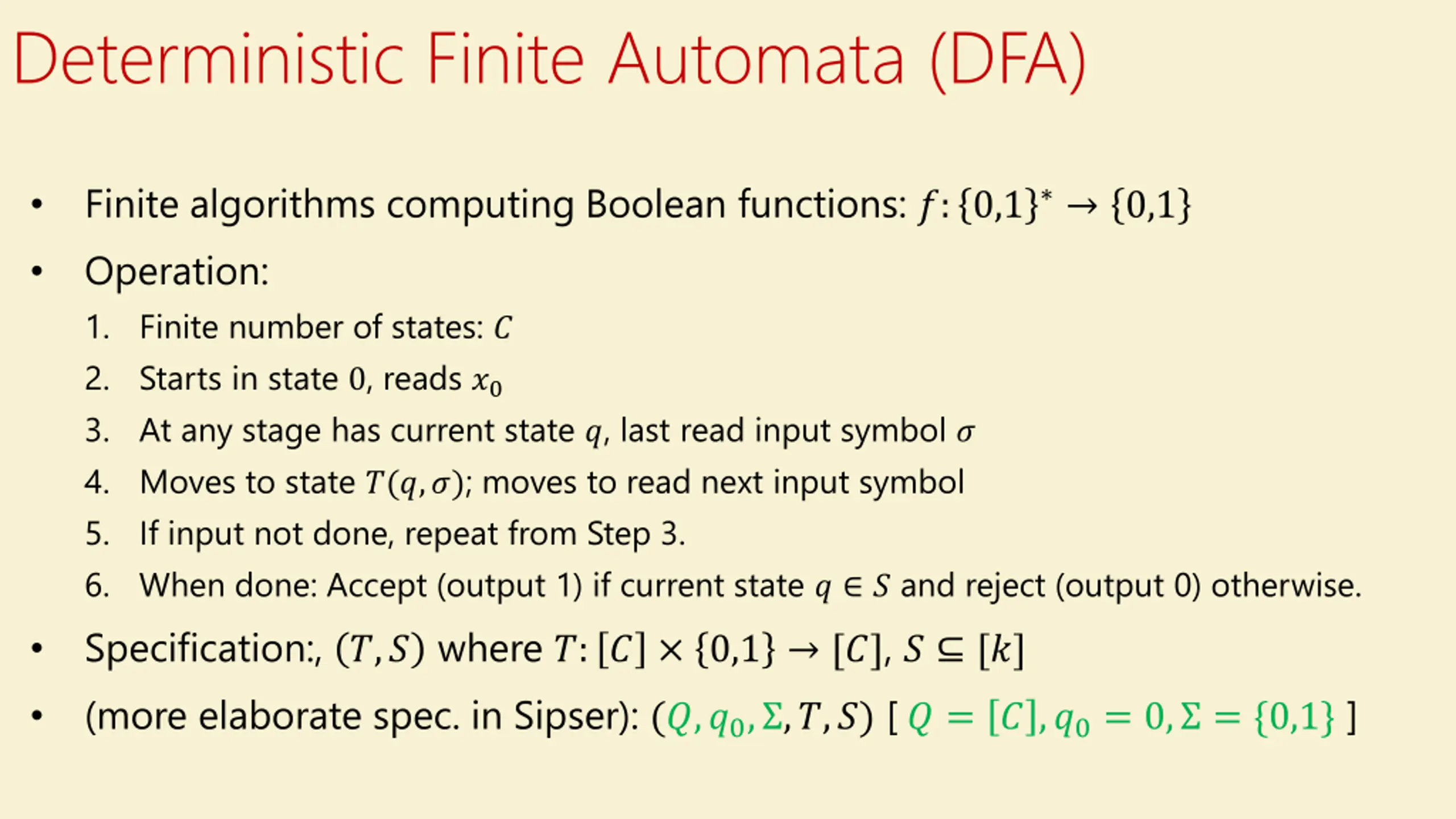 Deterministic Finite Automata (DFA) Finite algorithms computing Boolean functions: ?: 0,1 0,1 Operation: 1. Finite number of states: ? 2. Starts in state 0, reads ?0 3. At any stage has current state ?, last read input symbol ? 4. Moves to state ?(?,?); moves to read next input symbol 5. If input not done, repeat from Step 3. 6. When done: Accept (output 1) if current state ? ? and reject (output 0) otherwise. Specification:, ?,? where ?: ? 0,1 [?], ? [?] (more elaborate spec. in Sipser): (?,?0, ,?,?) [ ? = ? ,?0= 0, = {0,1} ]