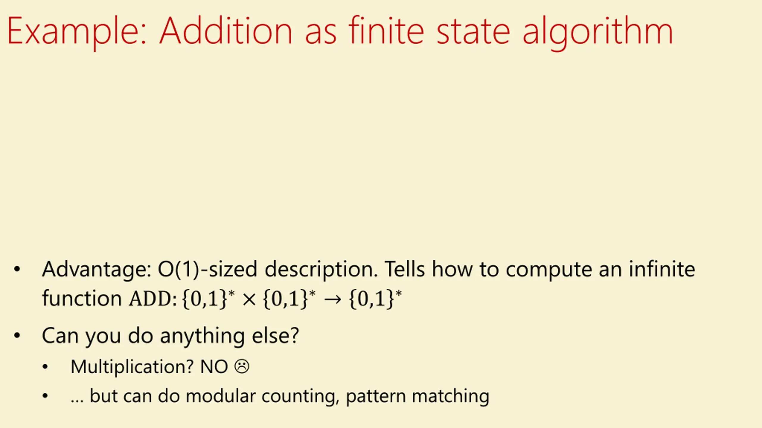 Example: Addition as finite state algorithm Advantage: O(1)-sized description. Tells how to compute an infinite function ADD: 0,1 0,1 0,1 Can you do anything else? Multiplication? NO but can do modular counting, pattern matching
