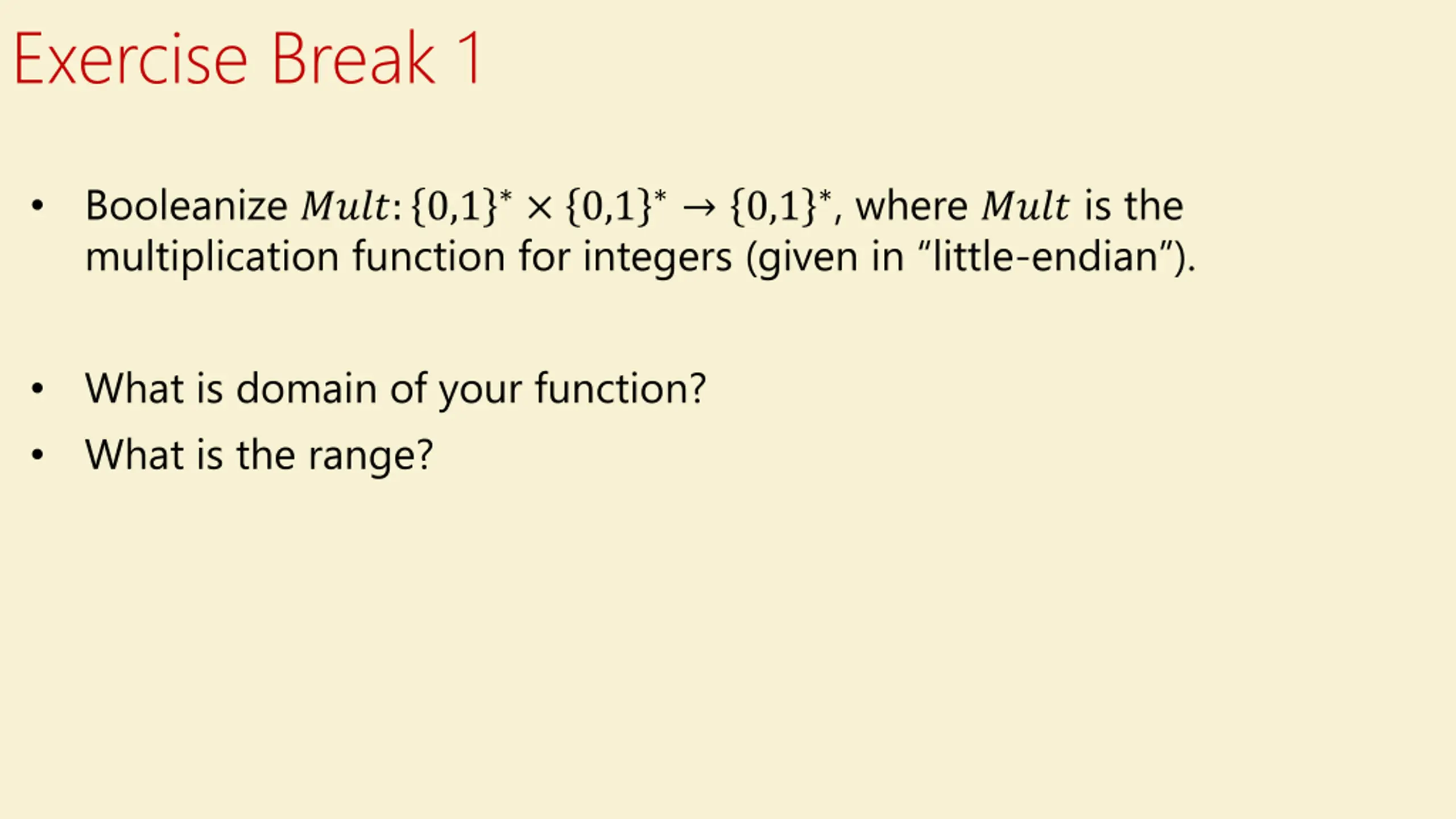Exercise Break 1 Booleanize ????: 0,1 0,1 0,1 , where ???? is the multiplication function for integers (given in little-endian ). What is domain of your function? What is the range?