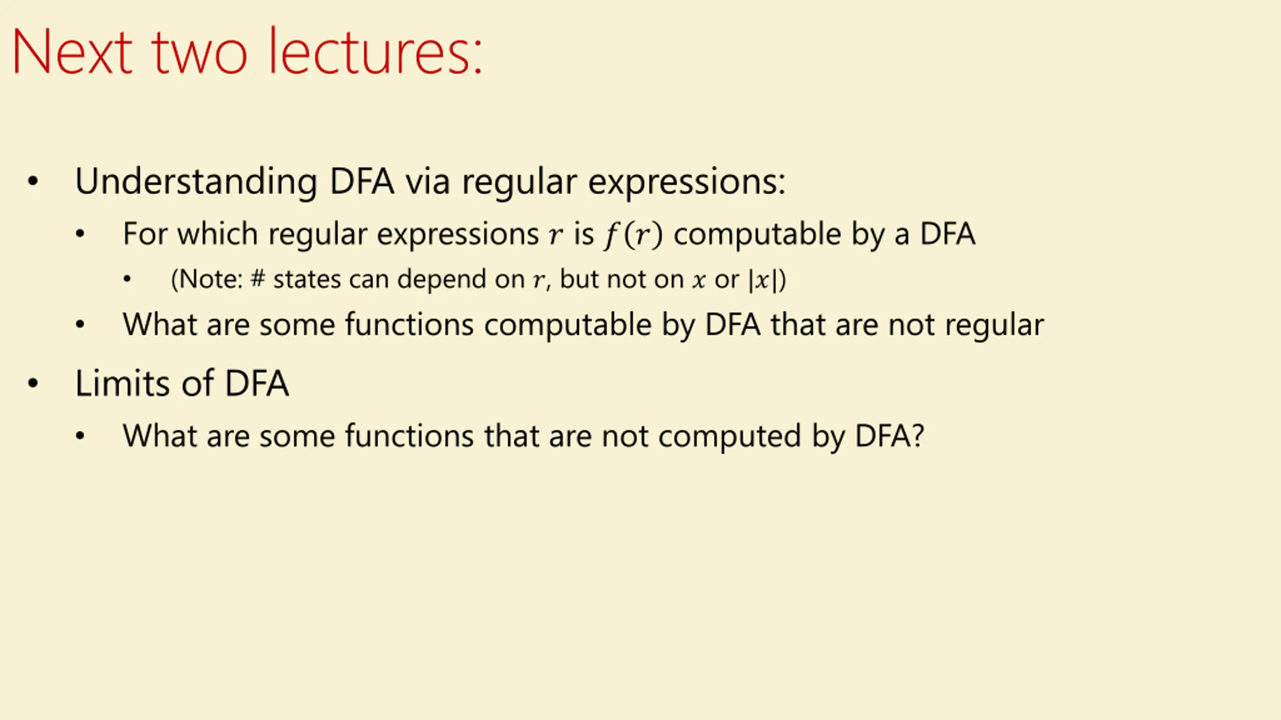 Next two lectures: Understanding DFA via regular expressions: For which regular expressions ? is ? ? computable by a DFA (Note: # states can depend on ?, but not on ? or |?|) What are some functions computable by DFA that are not regular Limits of DFA What are some functions that are not computed by DFA?