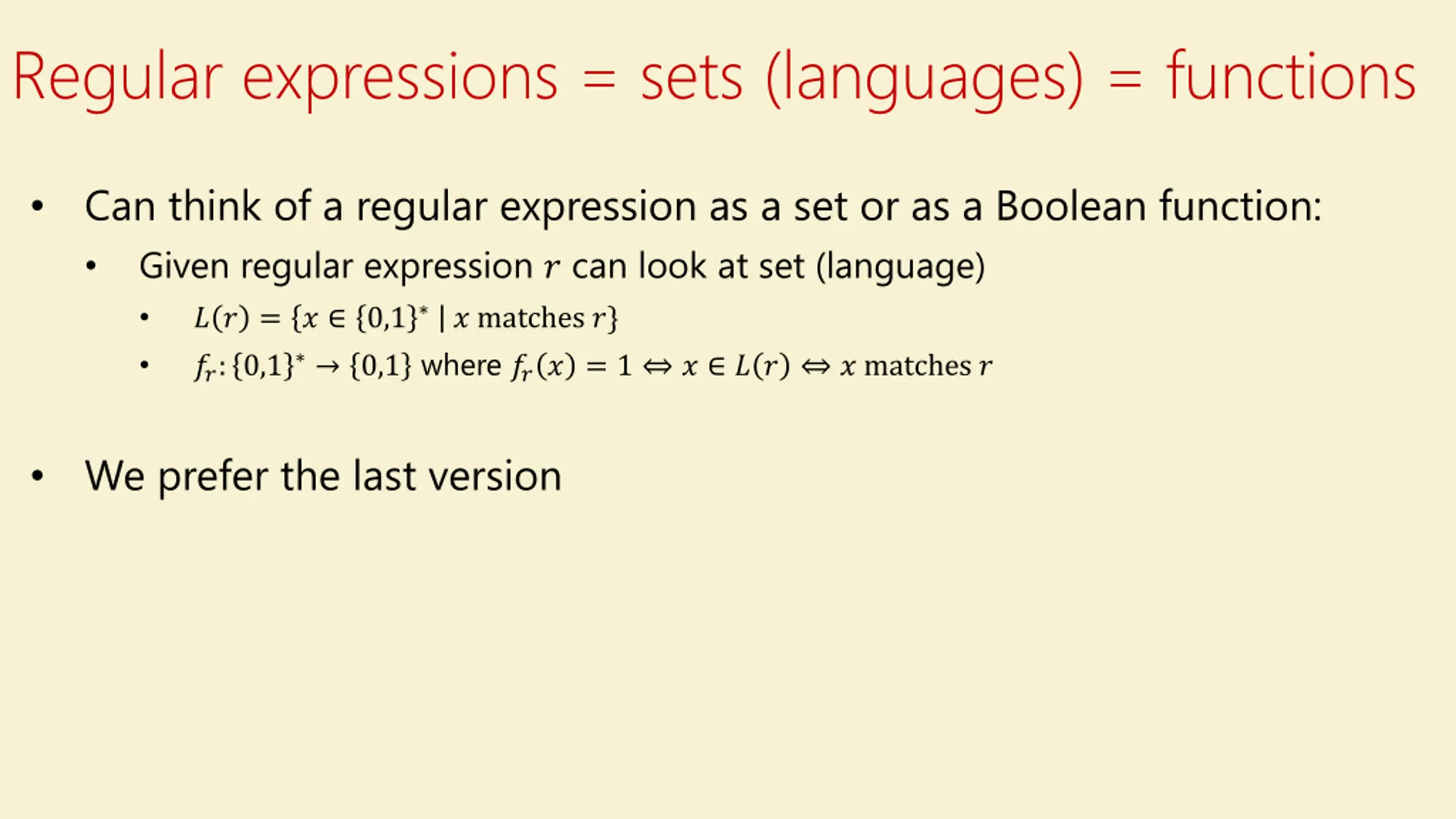 Regular expressions = sets (languages) = functions Can think of a regular expression as a set or as a Boolean function: Given regular expression ? can look at set (language) ? ? = ? 0,1 ? matches ?} ??: 0,1 0,1 where ??? = 1 ? ? ? ? matches ? We prefer the last version