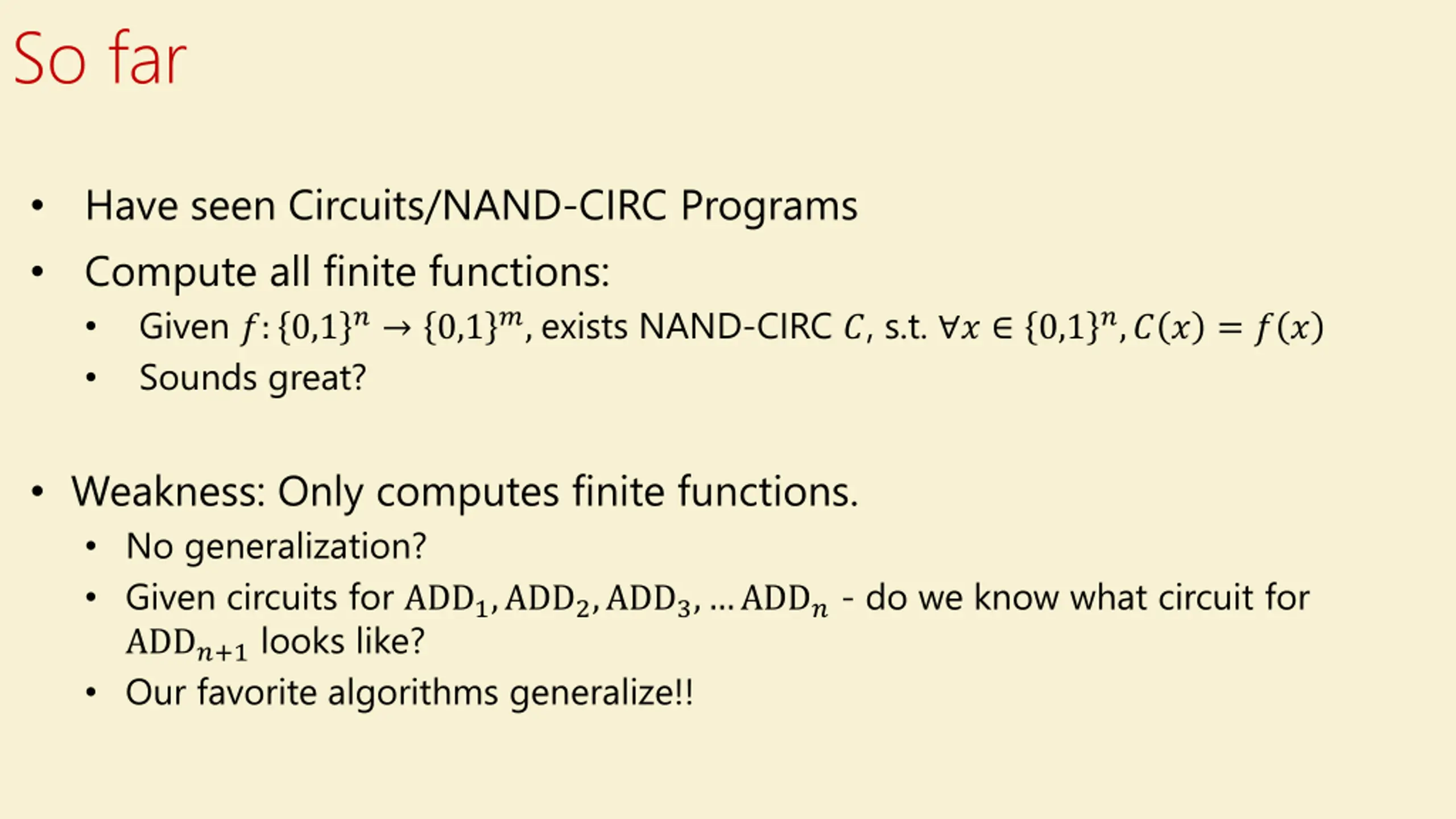 So far Have seen Circuits/NAND-CIRC Programs Compute all finite functions: Given ?: 0,1? 0,1?, exists NAND-CIRC ?, s.t. ? 0,1?,? ? = ? ? Sounds great? Weakness: Only computes finite functions. No generalization? Given circuits for ADD1,ADD2,ADD3, ADD? - do we know what circuit for ADD?+1 looks like? Our favorite algorithms generalize!!
