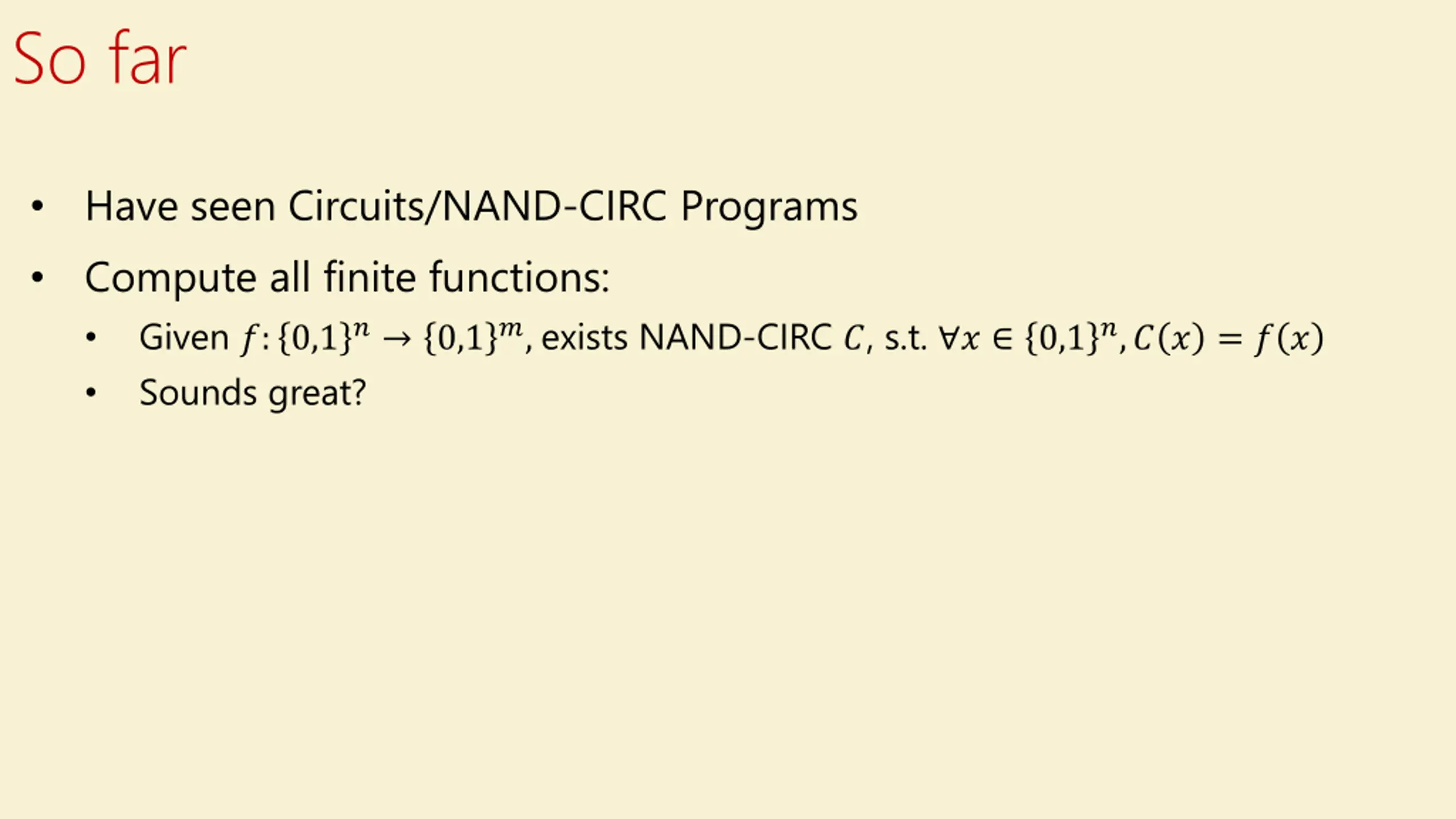 So far Have seen Circuits/NAND-CIRC Programs Compute all finite functions: Given ?: 0,1? 0,1?, exists NAND-CIRC ?, s.t. ? 0,1?,? ? = ? ? Sounds great?