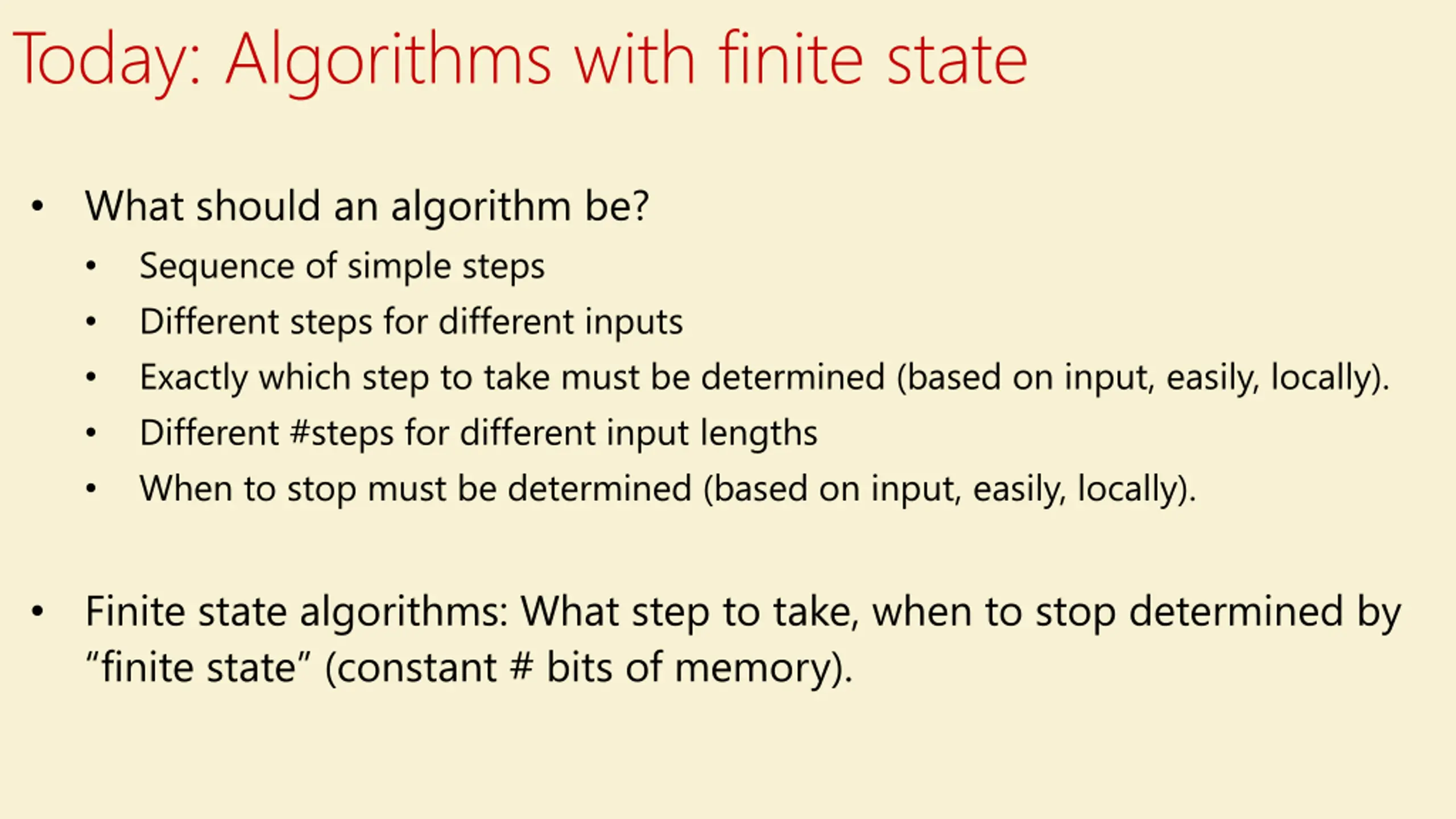 Today: Algorithms with finite state What should an algorithm be? Sequence of simple steps Different steps for different inputs Exactly which step to take must be determined (based on input, easily, locally). Different #steps for different input lengths When to stop must be determined (based on input, easily, locally). Finite state algorithms: What step to take, when to stop determined by finite state (constant # bits of memory).
