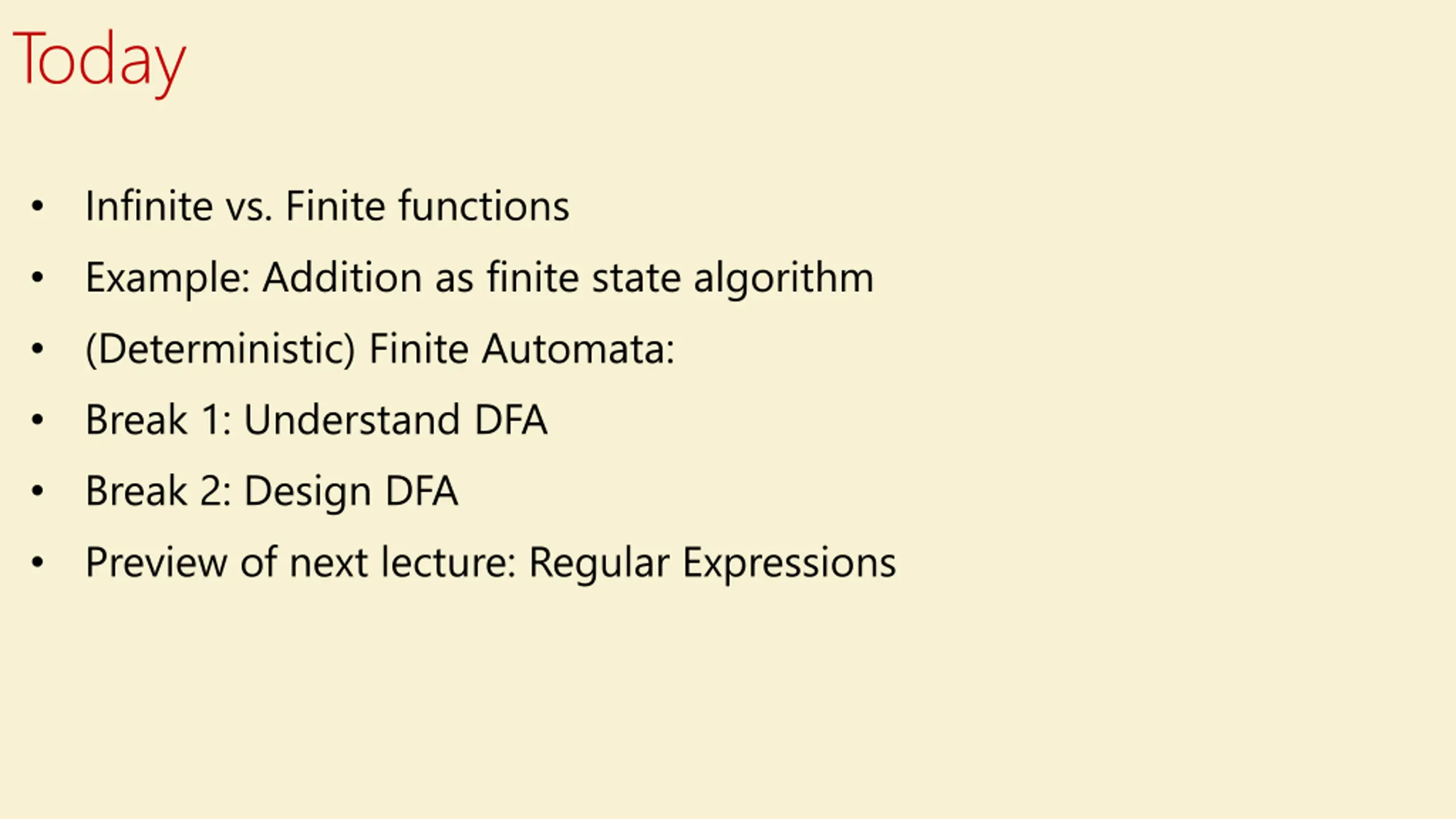 Today Infinite vs. Finite functions Example: Addition as finite state algorithm (Deterministic) Finite Automata: Break 1: Understand DFA Break 2: Design DFA Preview of next lecture: Regular Expressions