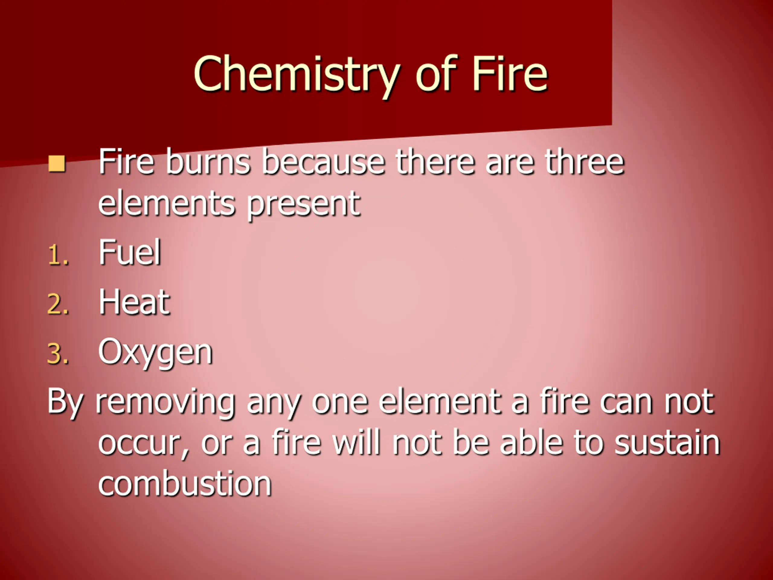 Chemistry of Fire Fire burns because there are three elements present 1. Fuel 2. Heat 3. Oxygen By removing any one element a fire can not occur, or a fire will not be able to sustain combustion