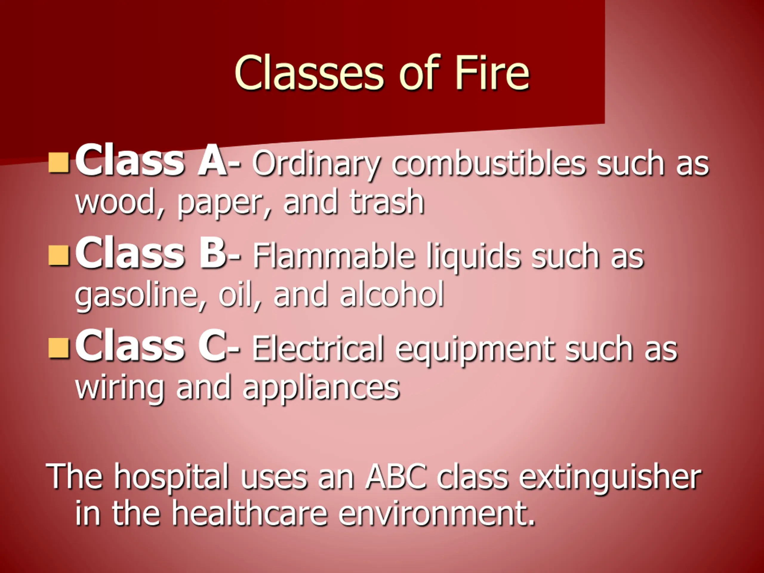 Classes of Fire Class A- Ordinary combustibles such as wood, paper, and trash Class B- Flammable liquids such as gasoline, oil, and alcohol Class C- Electrical equipment such as wiring and appliances The hospital uses an ABC class extinguisher in the healthcare environment.