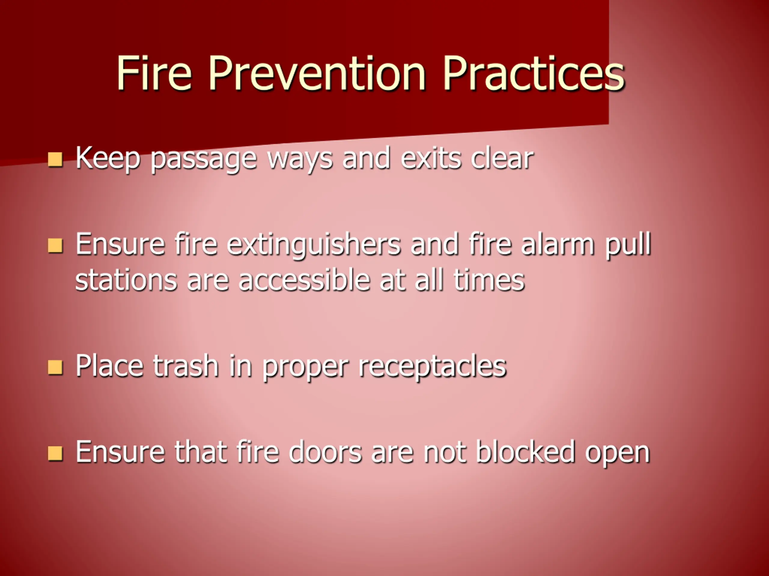 Fire Prevention Practices Keep passage ways and exits clear Ensure fire extinguishers and fire alarm pull stations are accessible at all times Place trash in proper receptacles Ensure that fire doors are not blocked open